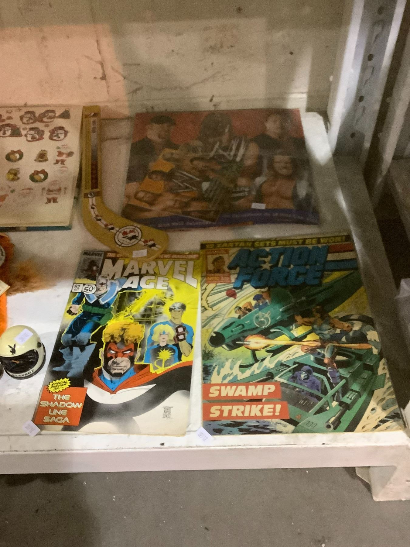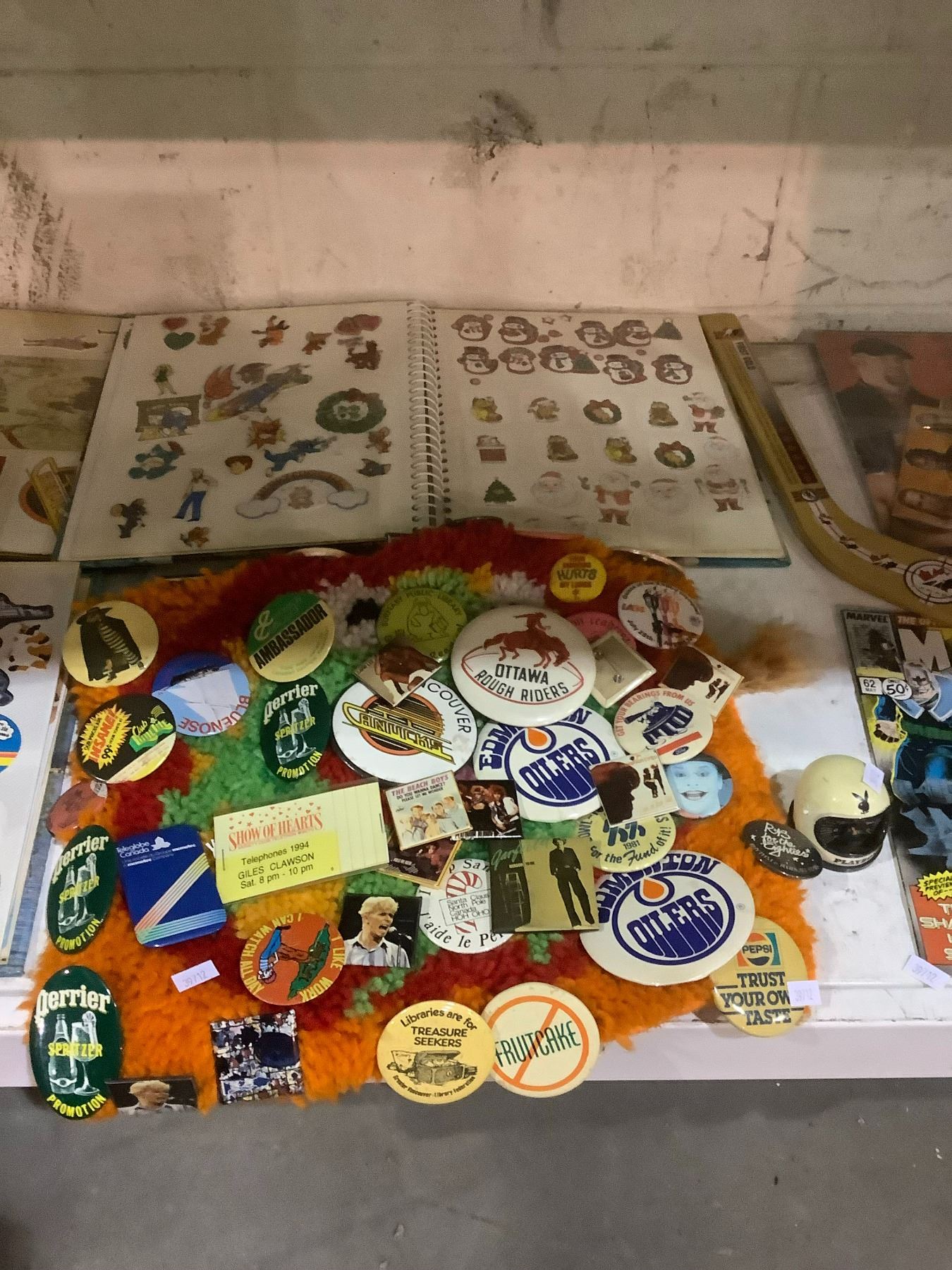 SHELF LOT OF COLLECTOR COMICS, BADGES, STICKERS, AND MORE