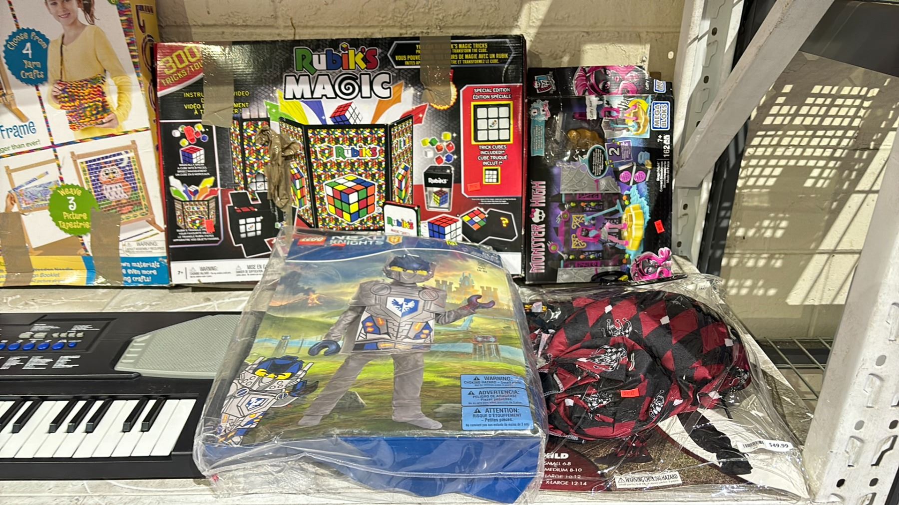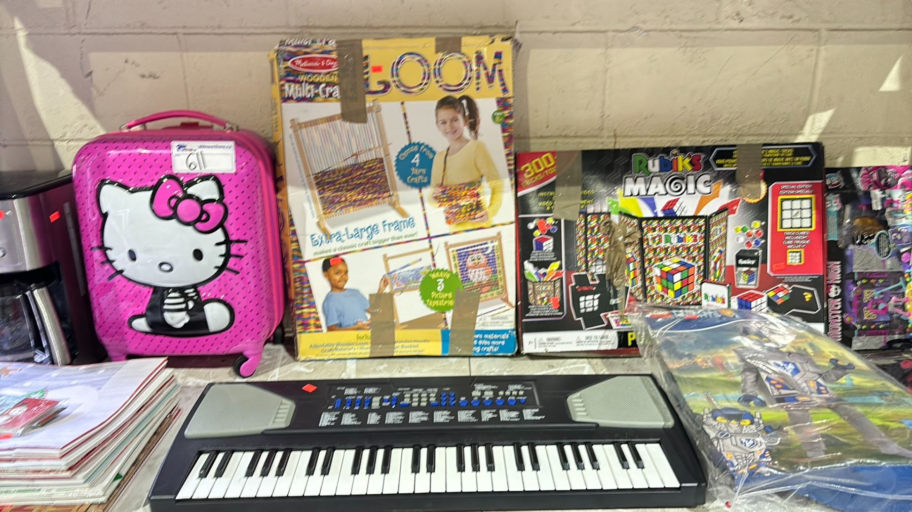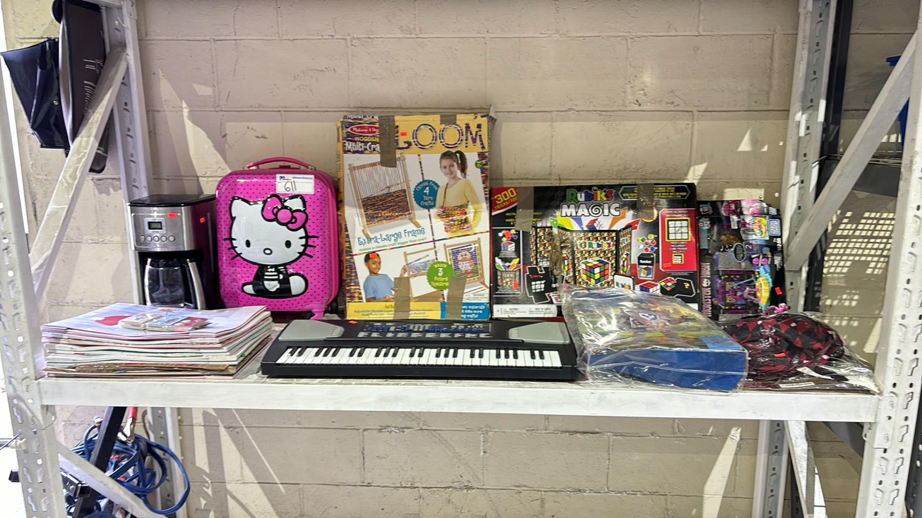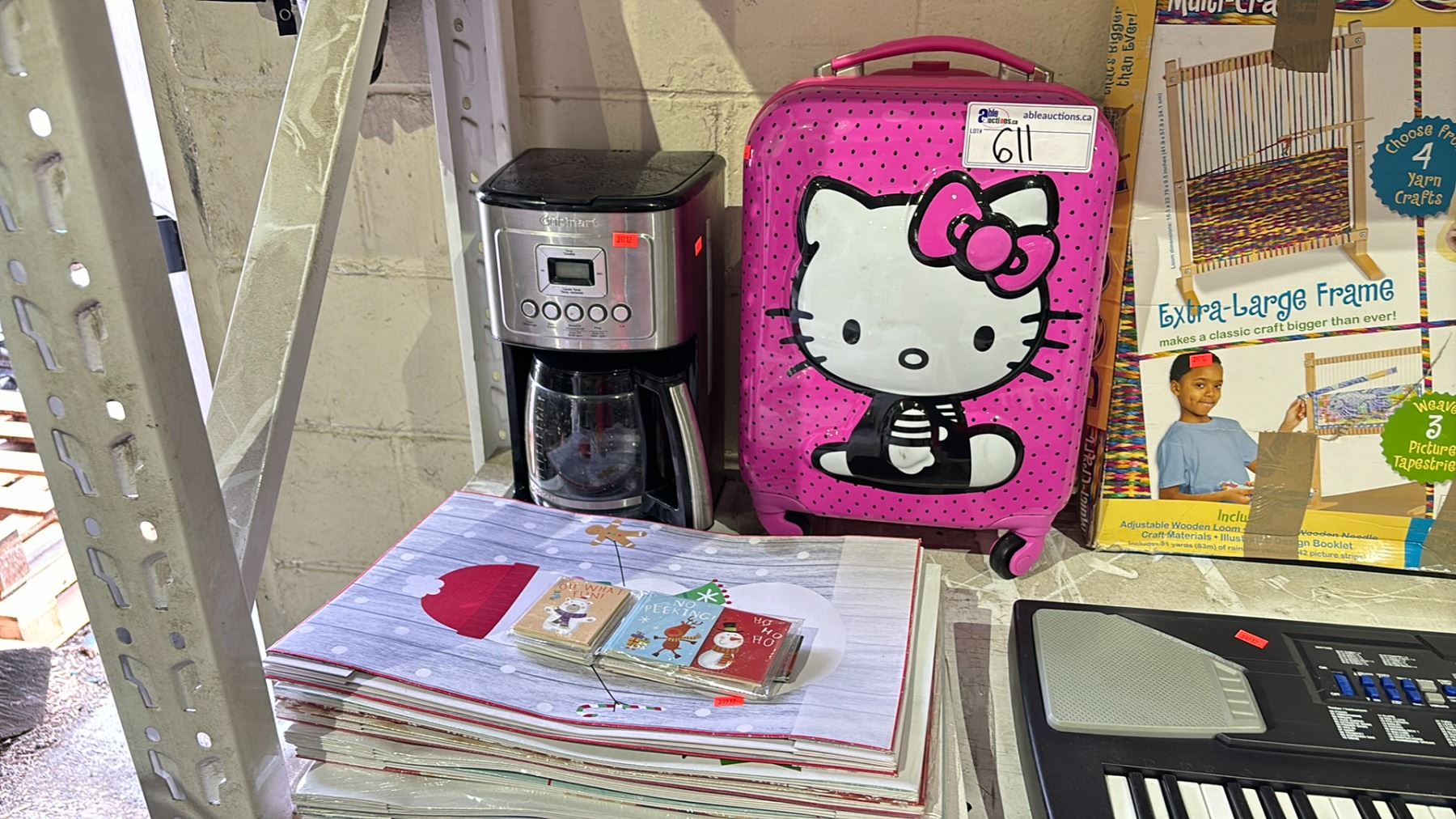 SHELF LOT OF KEYBOARD, SUITCASE, COFFEE MAKER AND MORE