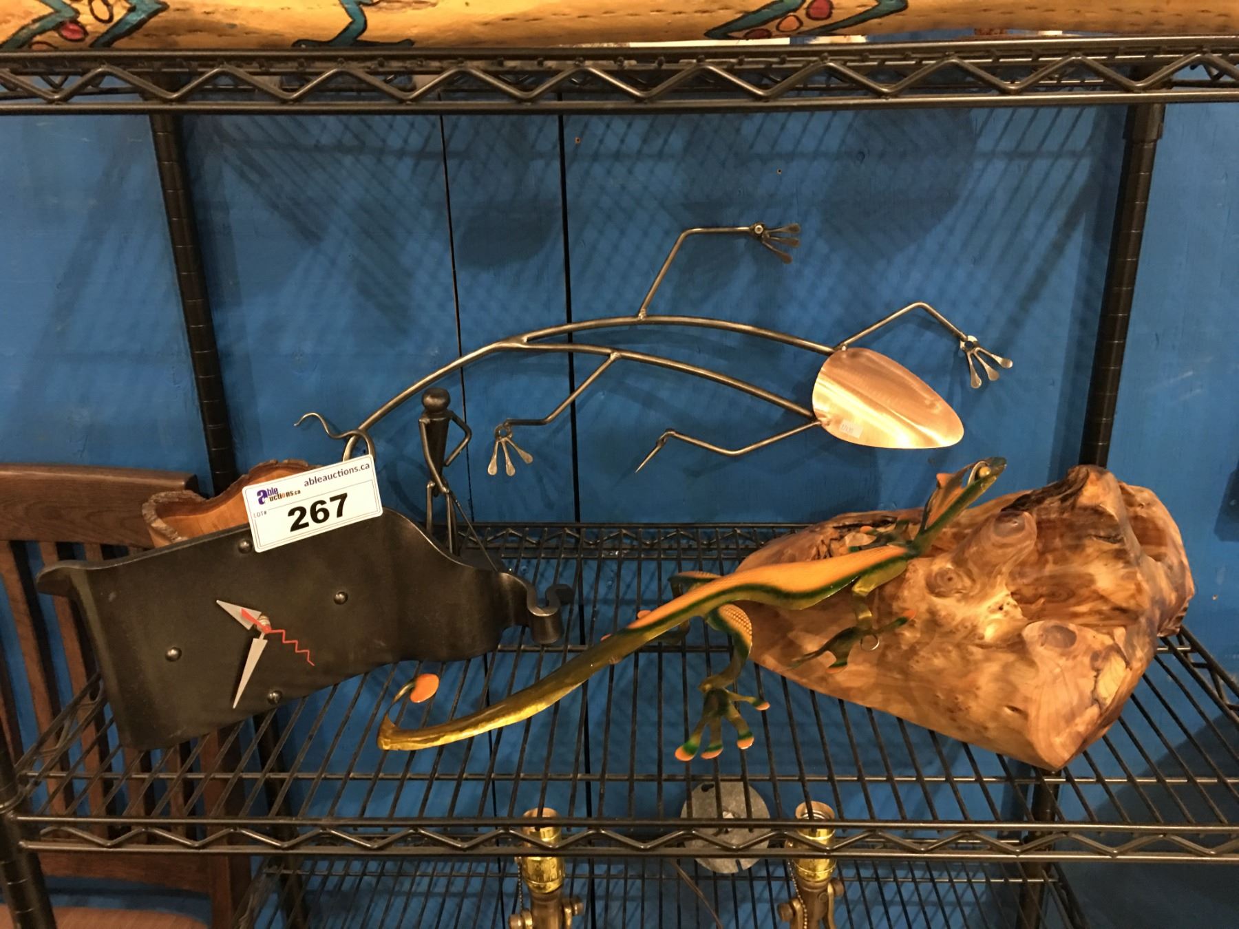 SHELF LOT OF METAL ART & SCULPTED WOOD PIECES