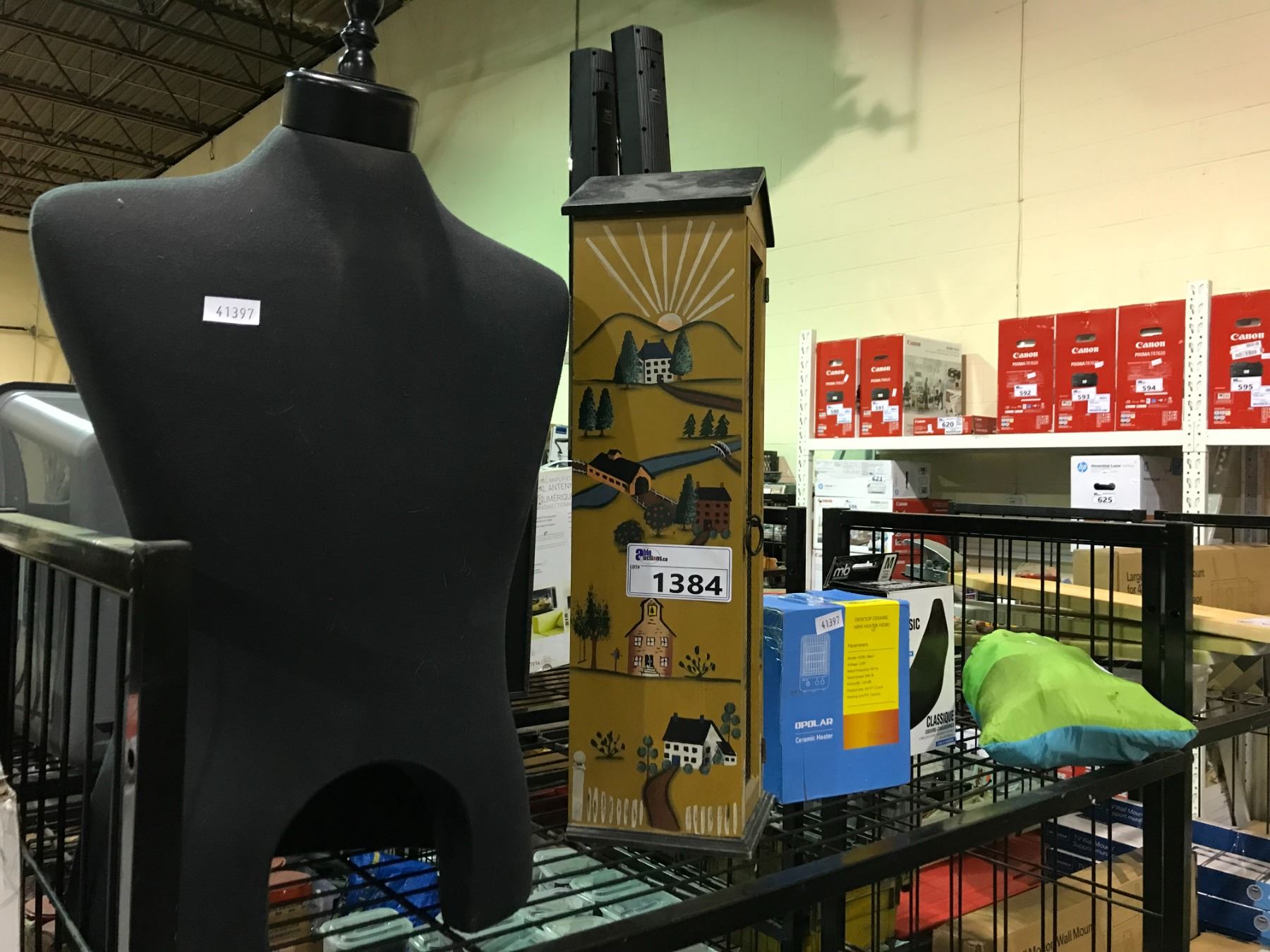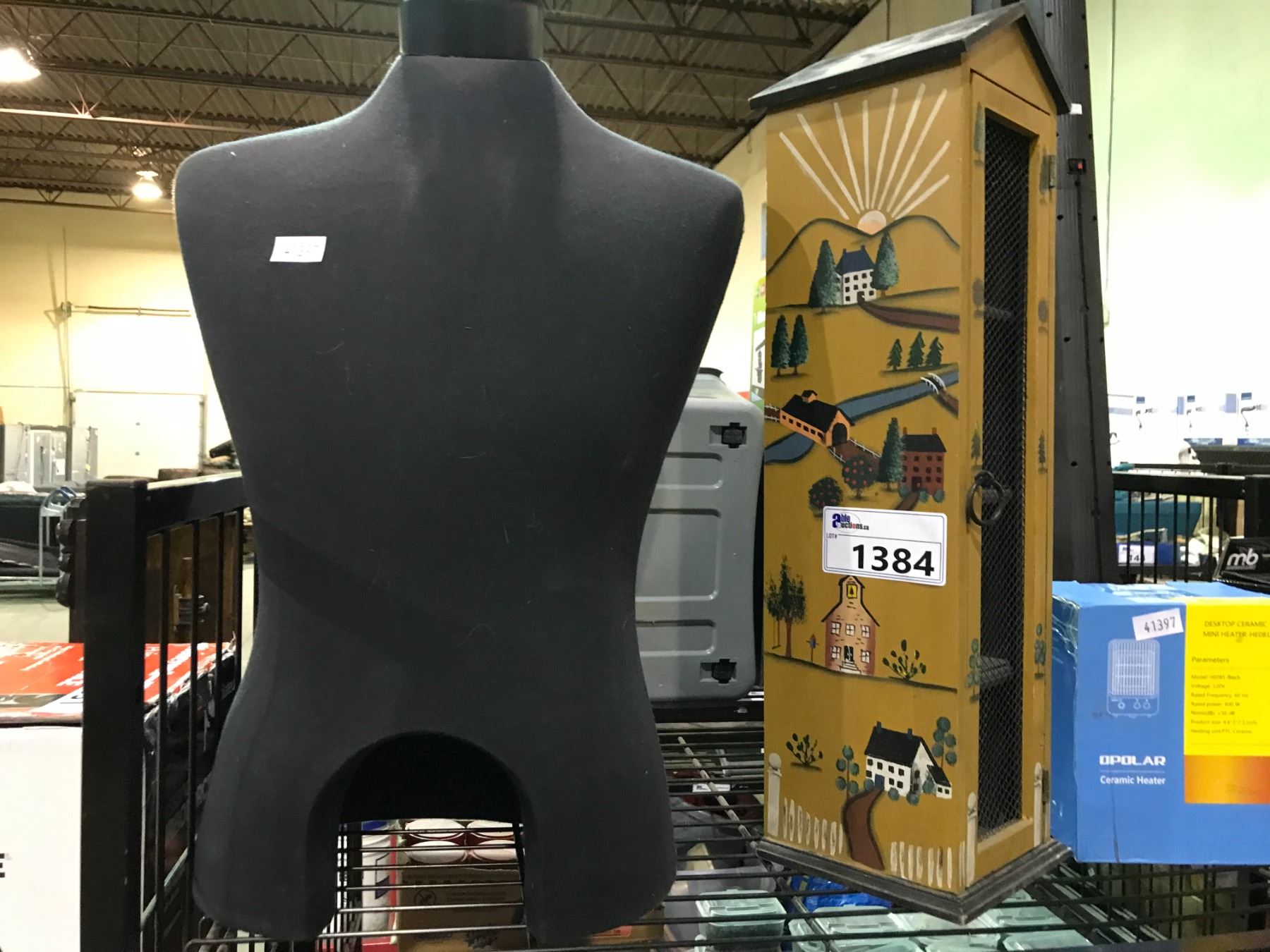 SHELF LOT OF SEWING MANNEQUIN, SMALL CABINET, CERAMIC HEATER AND MORE