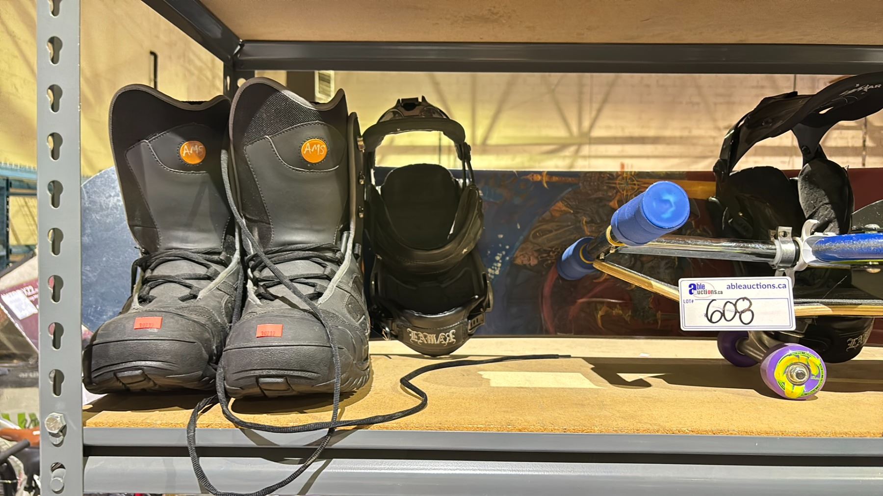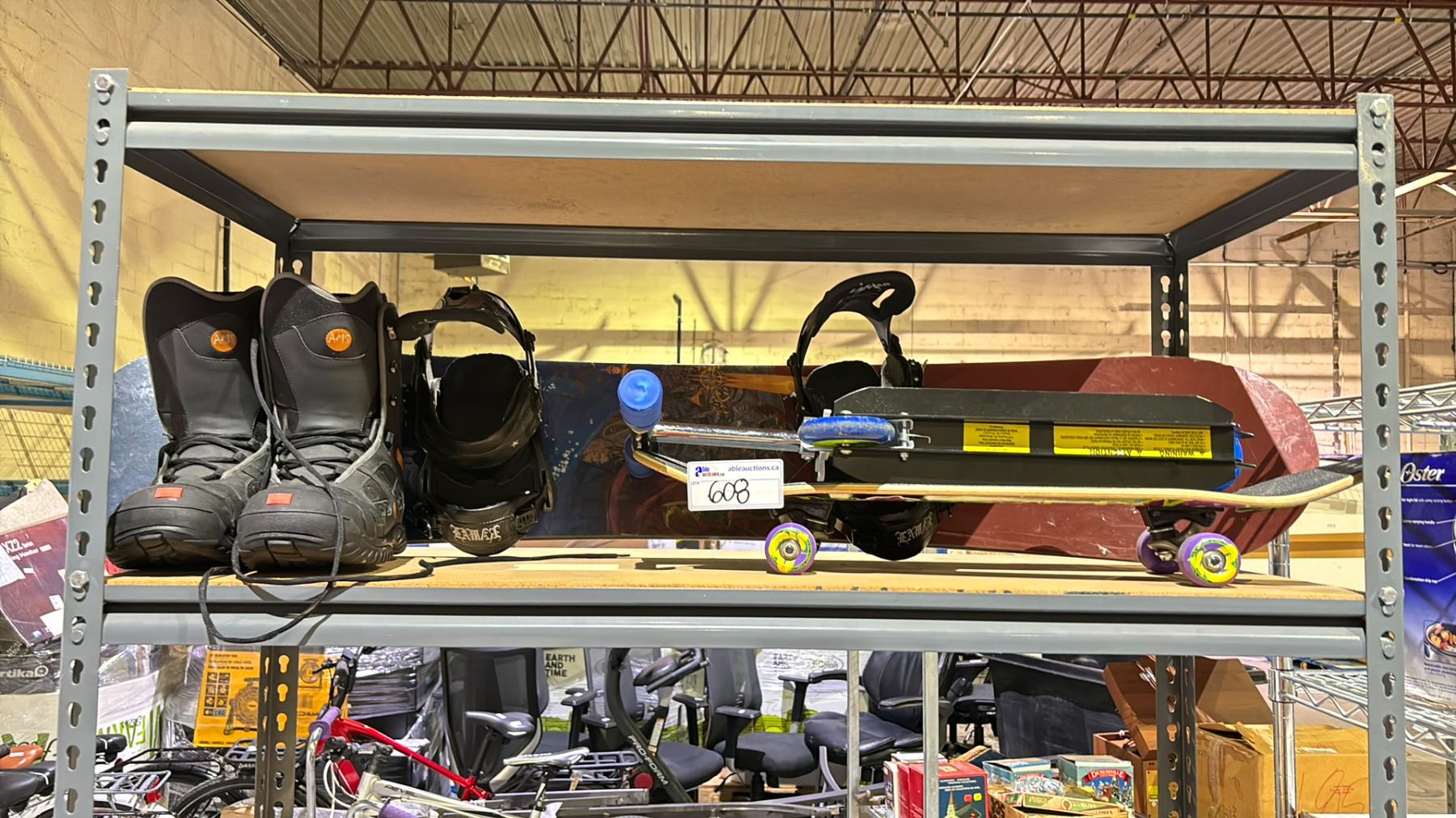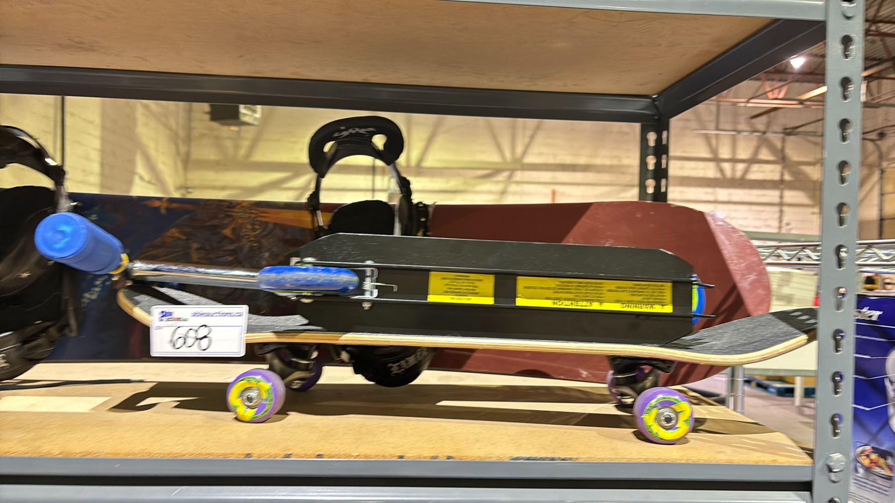 SHELF LOT OF SNOWBOARD, SKATEBOARD, SCOOTER AND MORE