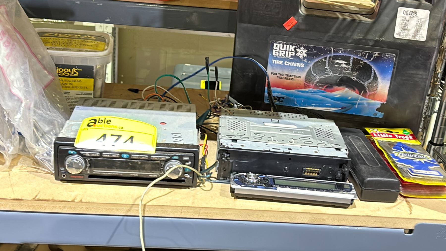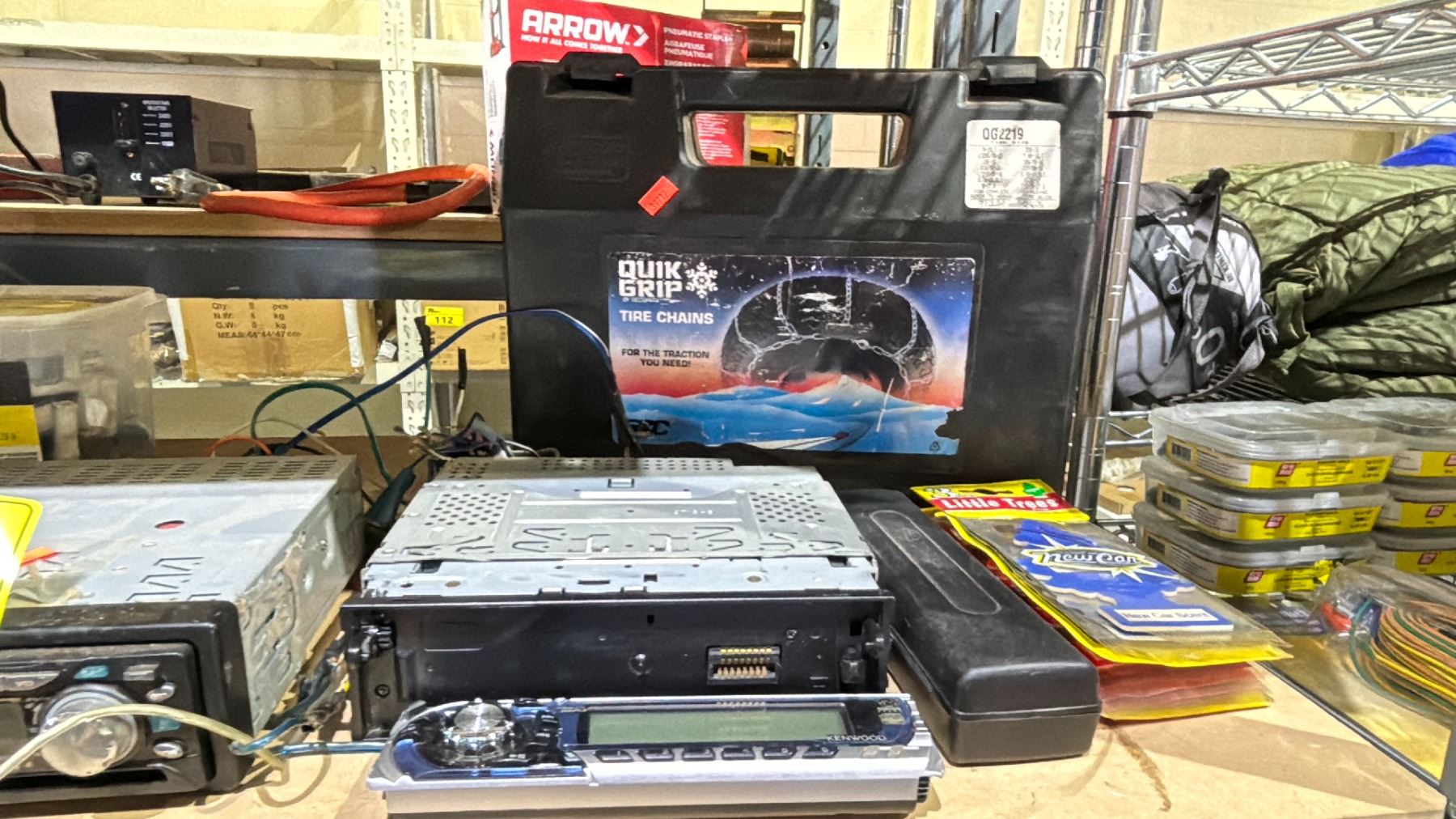 SHELF LOT OF TIRE CHAINS, CAR RADIOS, NAILS AND MORE