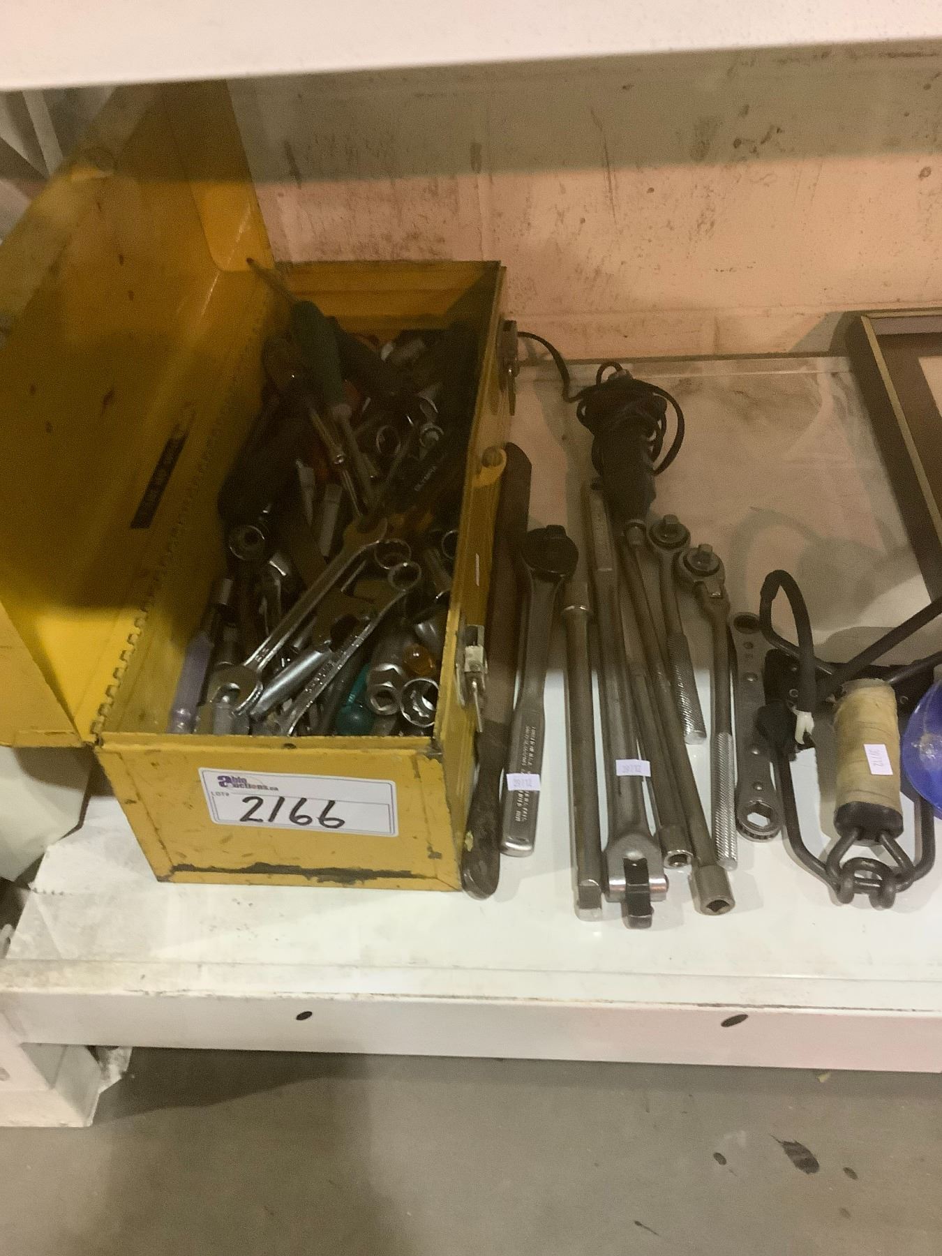 SHELF LOT OF TOOLS, CASSETTES, PICTURES
