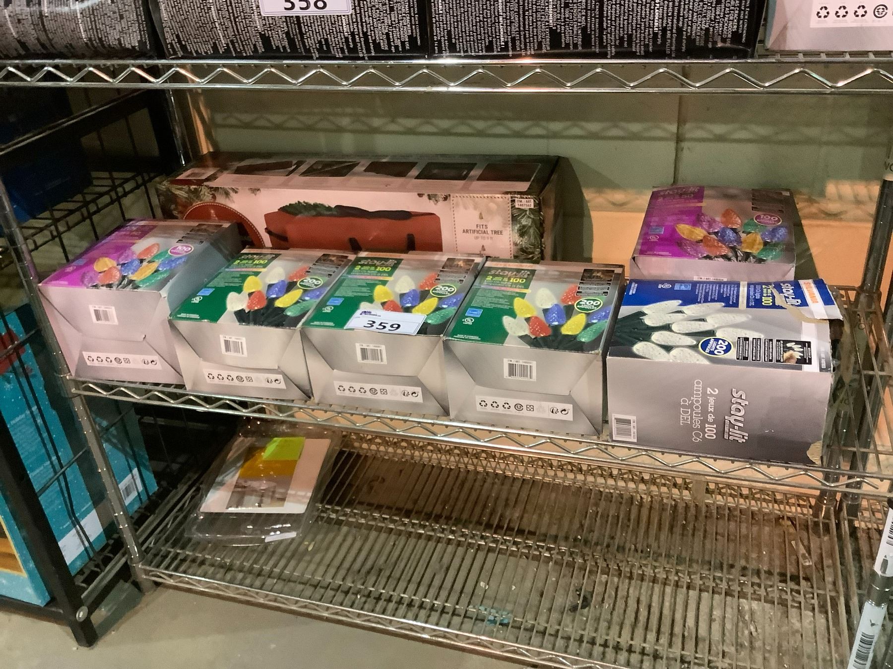 SHELF LOT WITH ASSORTED CHRISTMAS LIGHTS, CHRISTMAS TREE BAG