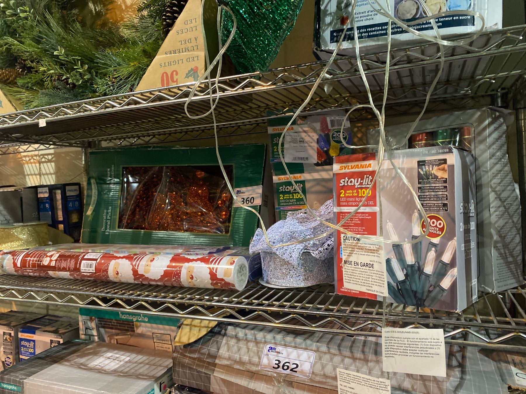 SHELF LOT WITH CHRISTMAS LIGHTS, WRAPPING PAPER, RIBBON