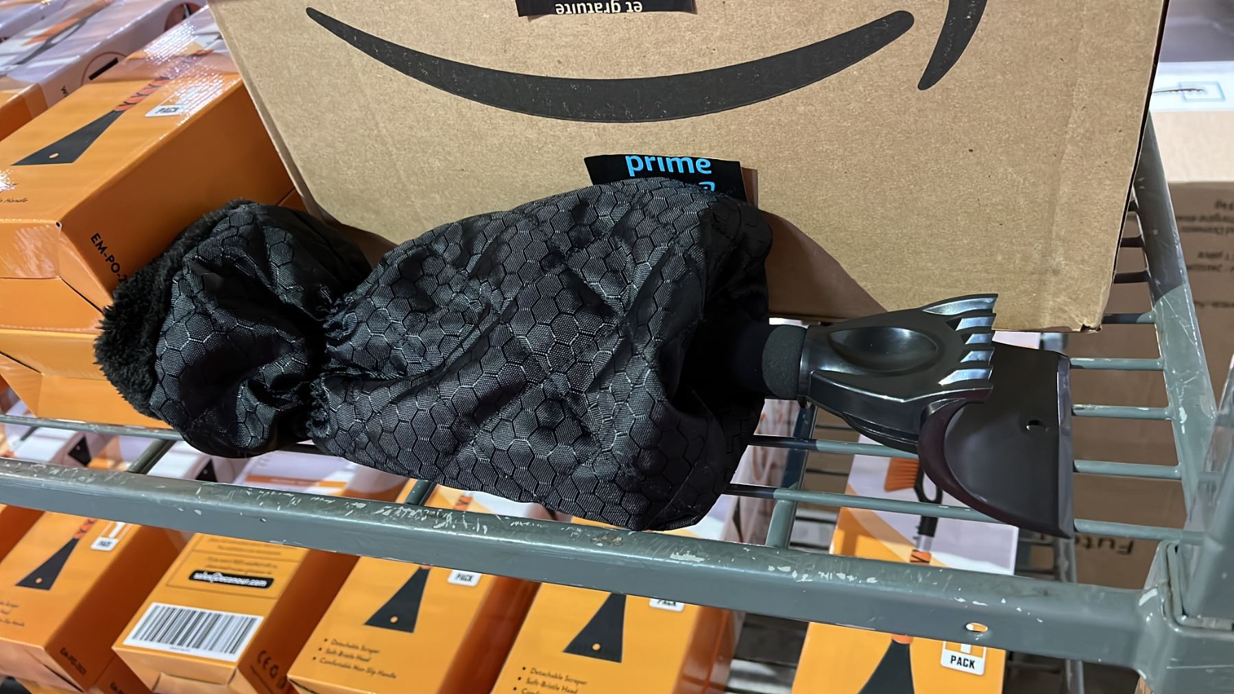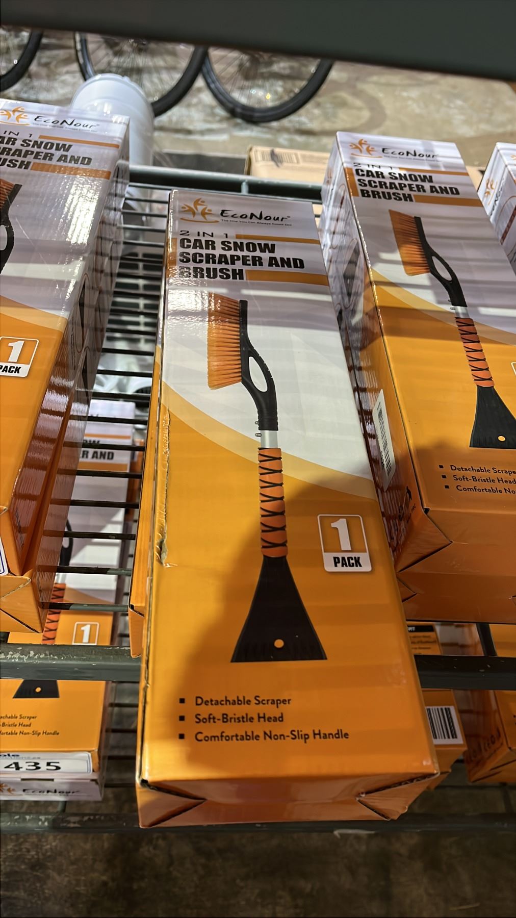 SHELF OF 2 IN 1 CAR SNOW SCRAPER & BRUSHES + MITTENS WITH BUILT IN WINDOW SCRAPER