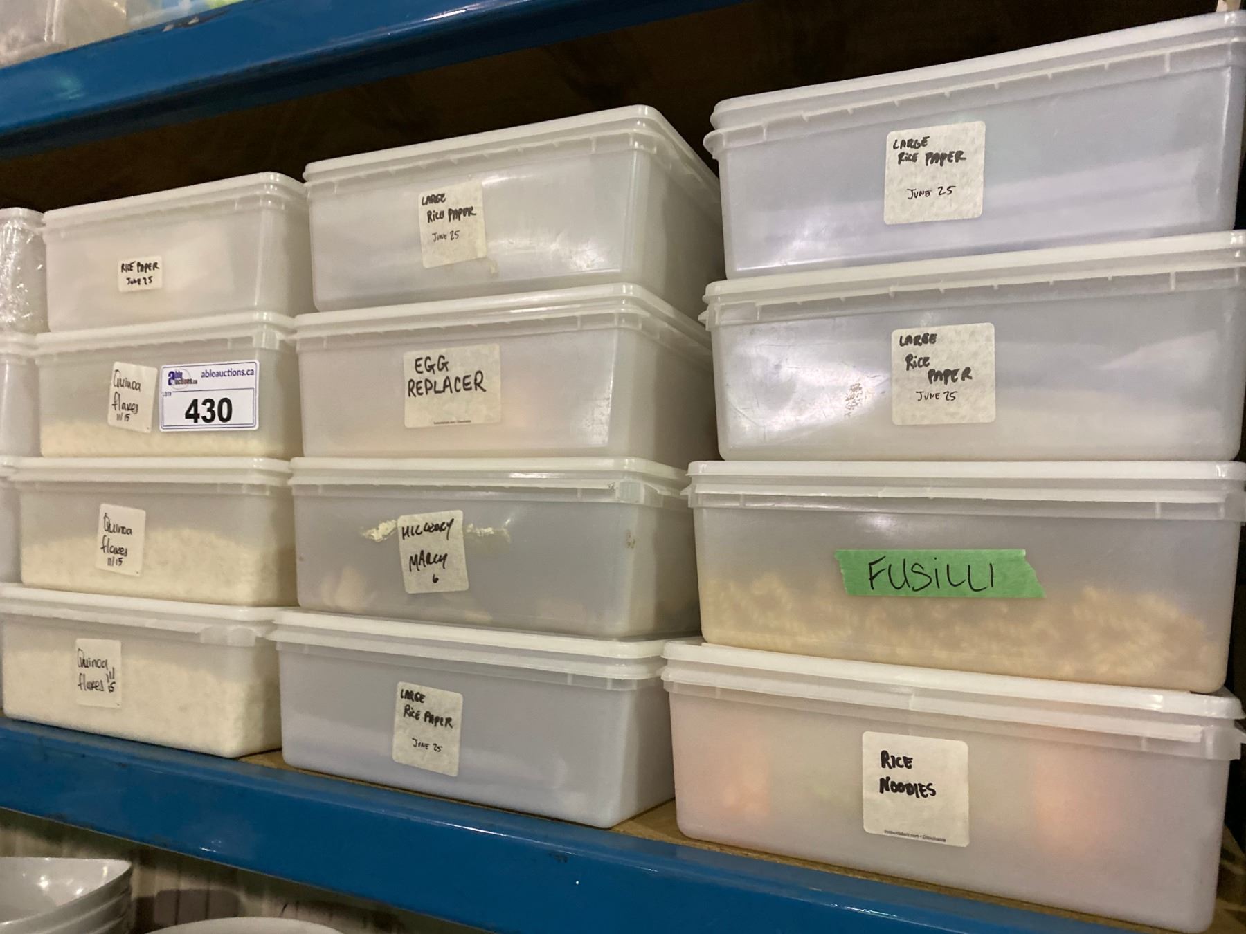 SHELF OF ASSORTED BINS OF DYED GOODS / PASTA