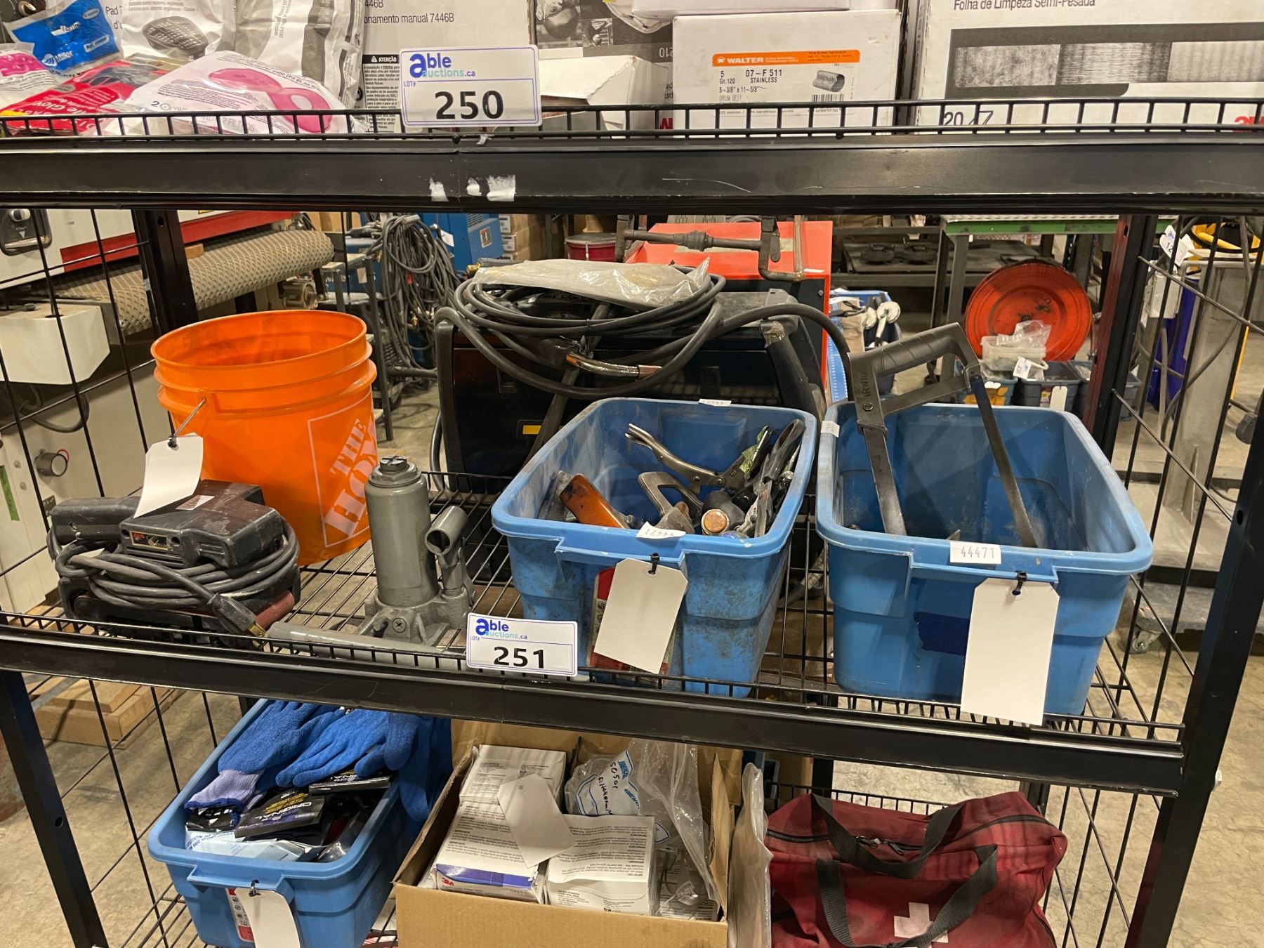 SHELF OF ASSORTED C-CLAMPS, VISE GRIPS, BOTTLE JACK, SKIL ELECTRIC BELT SANDER, & BUCKET OF GRINDER GUARDS