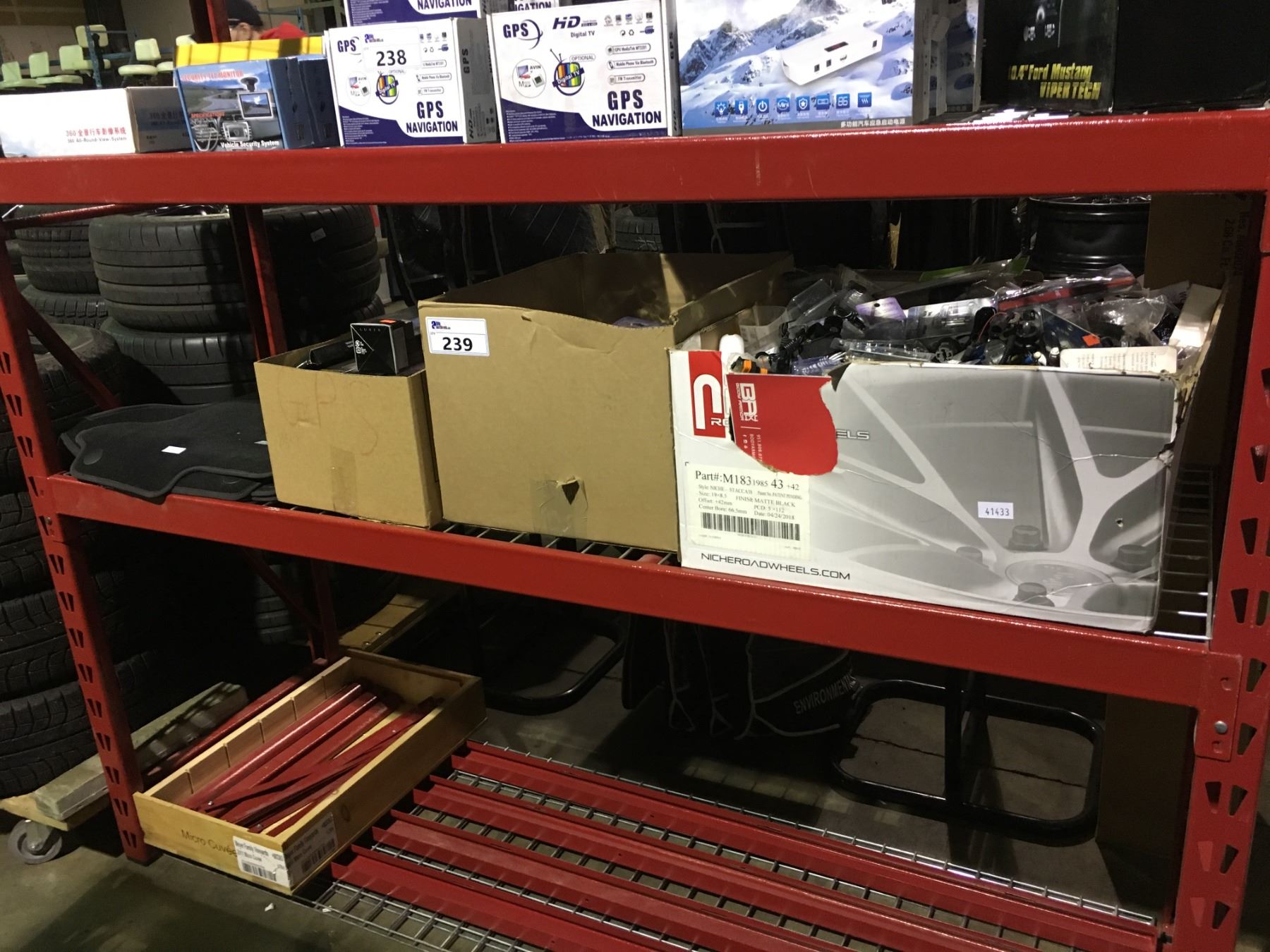 SHELF OF ASSORTED CAR ACCESSORIES INCLUDING LIGHT UP SHIFT KNOBS, LED LIGHTING AND CAR MATS