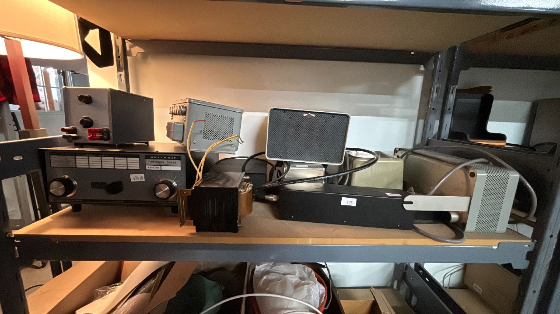 SHELF OF ASSORTED CB RADIO ITEMS: ANTENNA TUNER, POWER SUPPLIES, ATTENUATOR SET & MORE