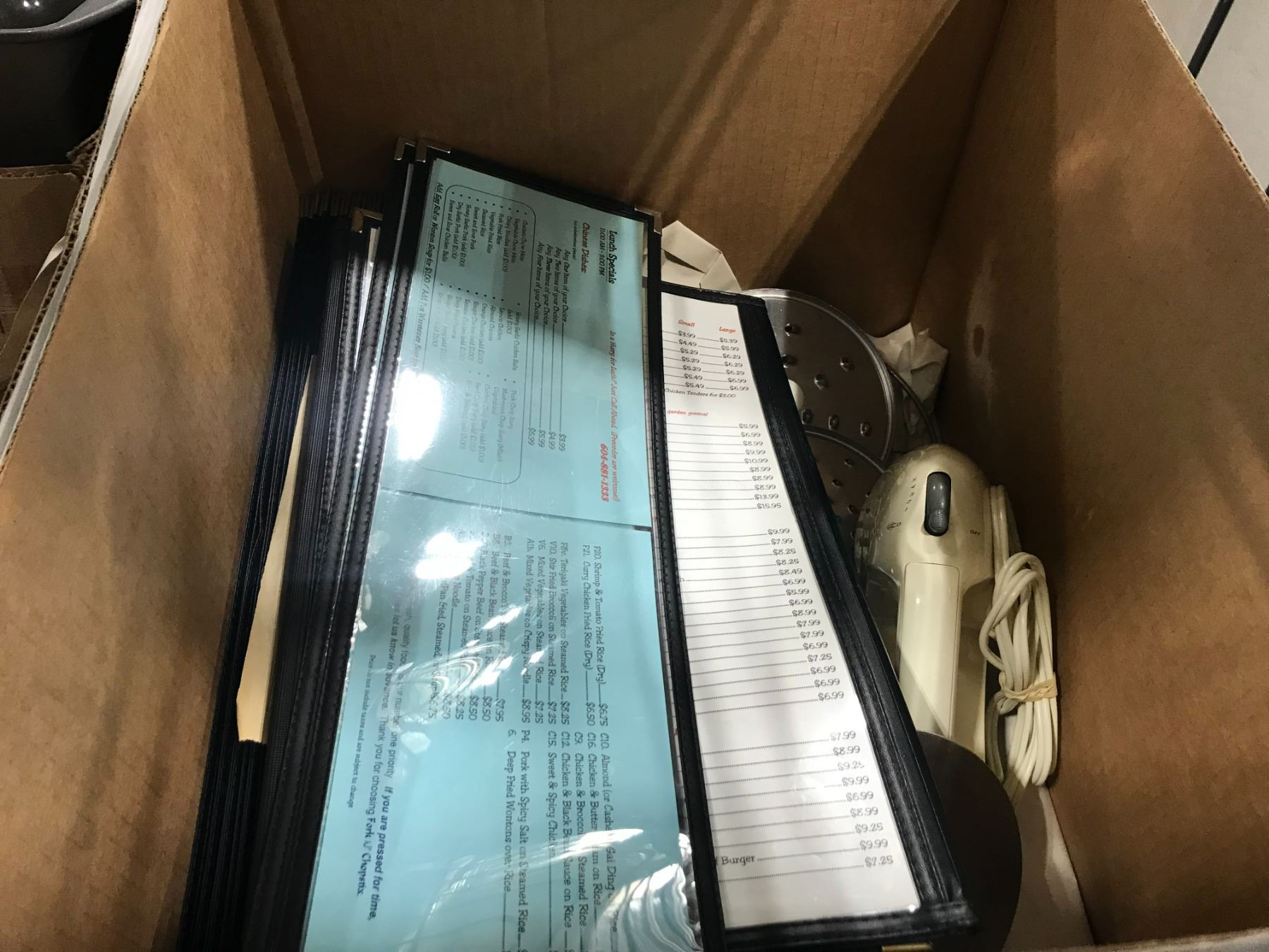 SHELF OF ASSORTED COMMERCIAL RESTAURANT ACCESSORIES INCLUDING CONDIMENT HOLDERS, MENU HOLDERS, HAND MIXER, FOOD PROCESSOR ATTACHMENTS, AND KETTLE