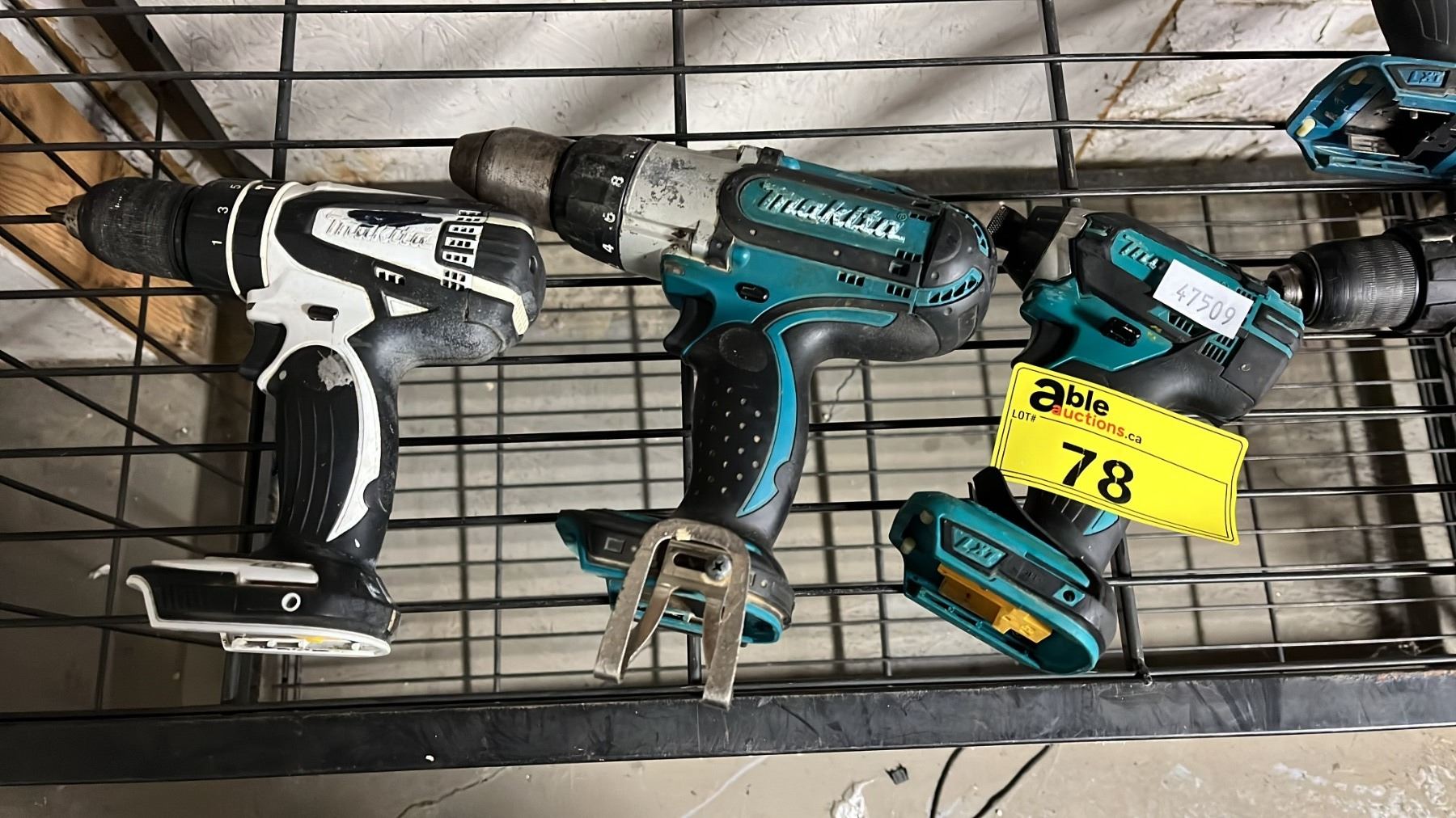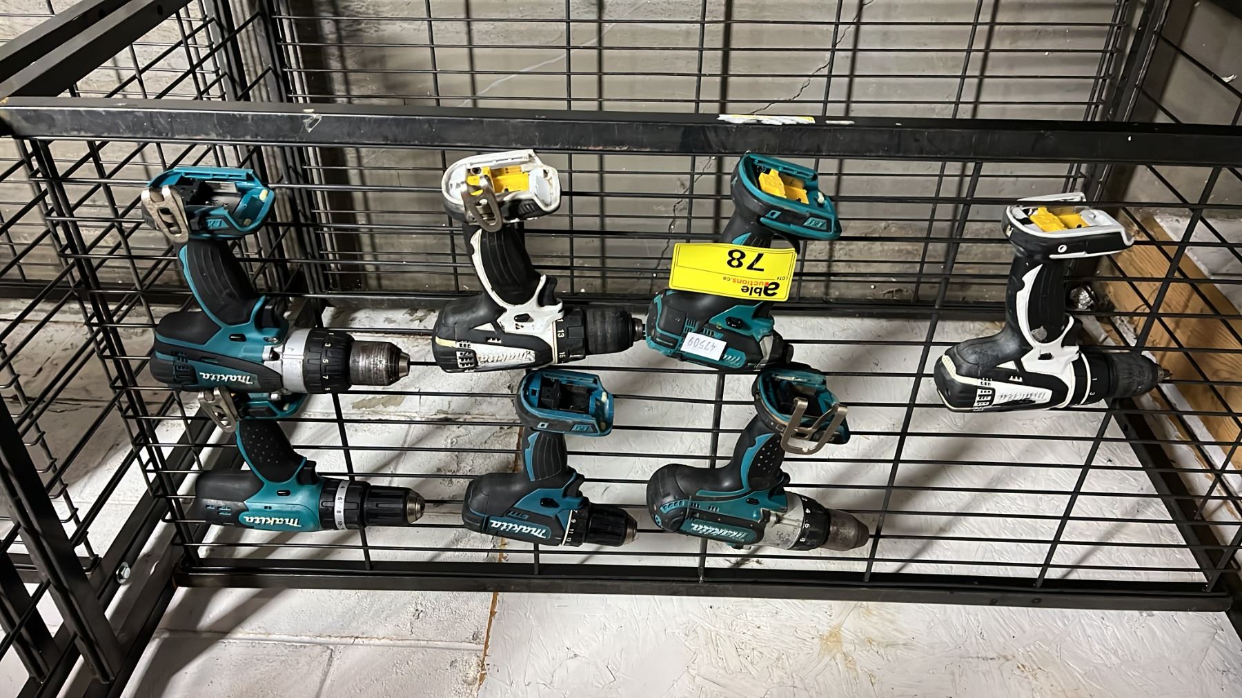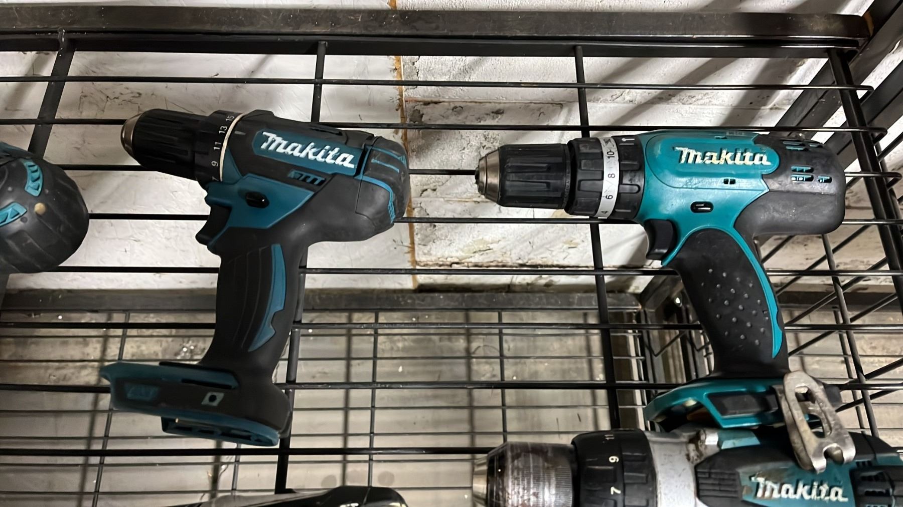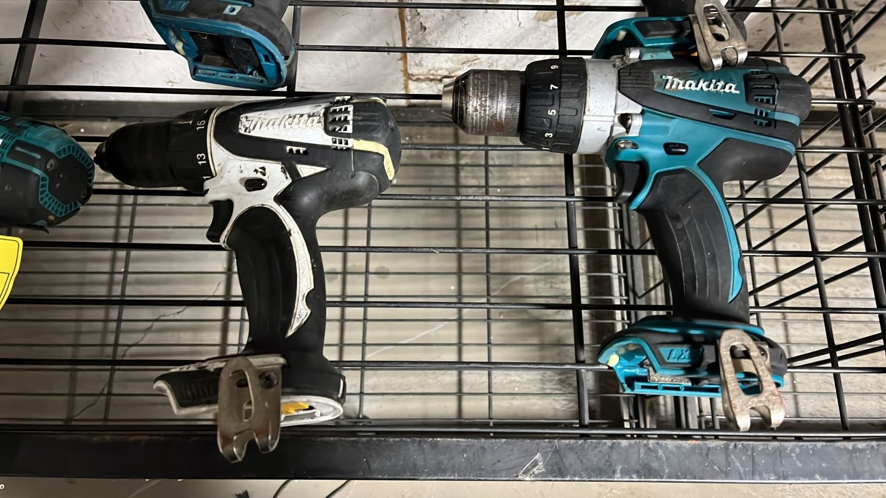 SHELF OF ASSORTED CORDLESS MAKITA DRILLS *NO BATTERIES*