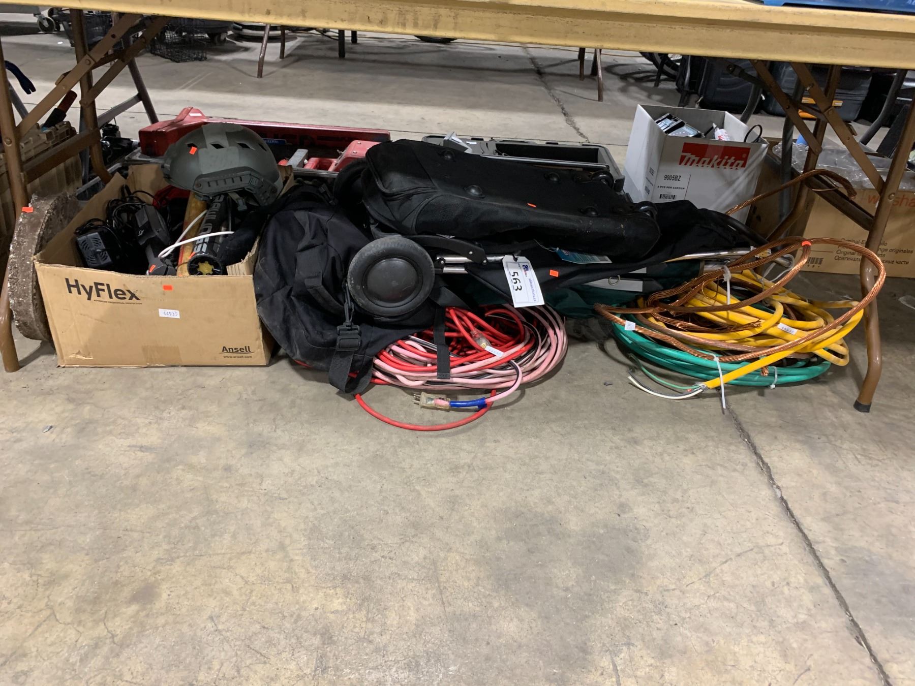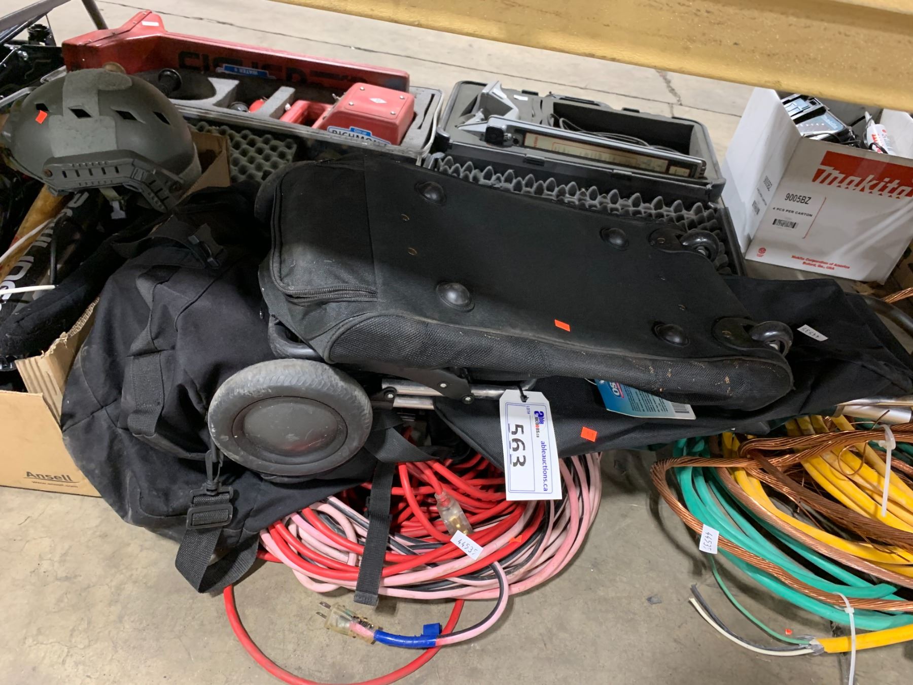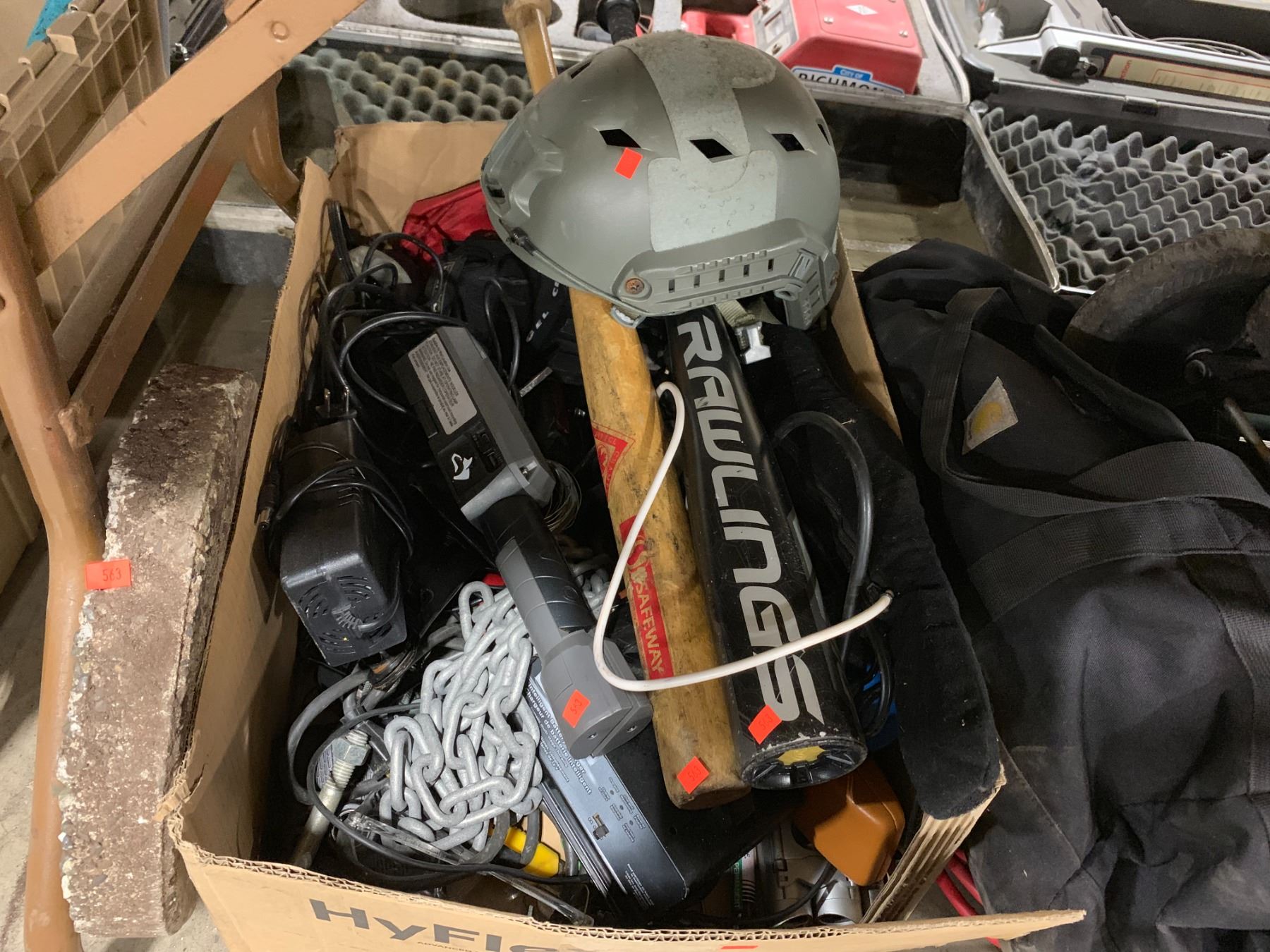 SHELF OF ASSORTED ELECTRIC EXTENSION CORDS, CABLES, SHOPPING CART, BOX OF ASSORTED BASEBALL BATS, PORTABLE FLASHLIGHT, CHAIN & MISC