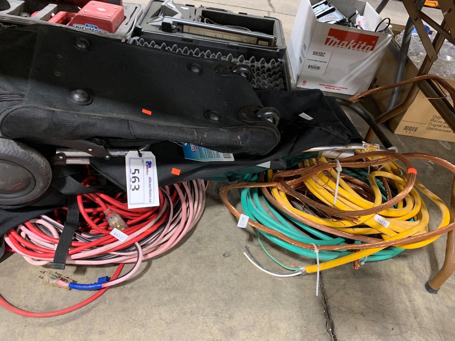 SHELF OF ASSORTED ELECTRIC EXTENSION CORDS, CABLES, SHOPPING CART, BOX OF ASSORTED BASEBALL BATS,