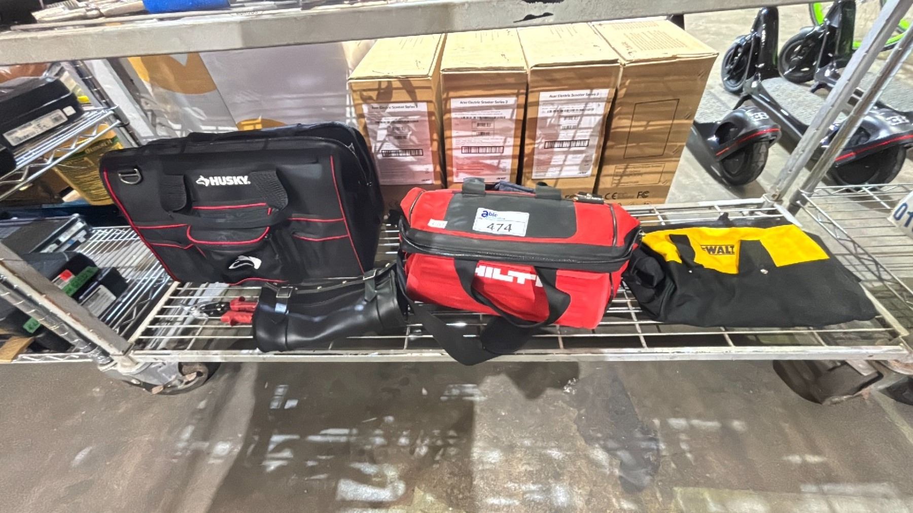 SHELF OF ASSORTED EMPTY TOOL BAGS & PAIR OF TIN SHEARS