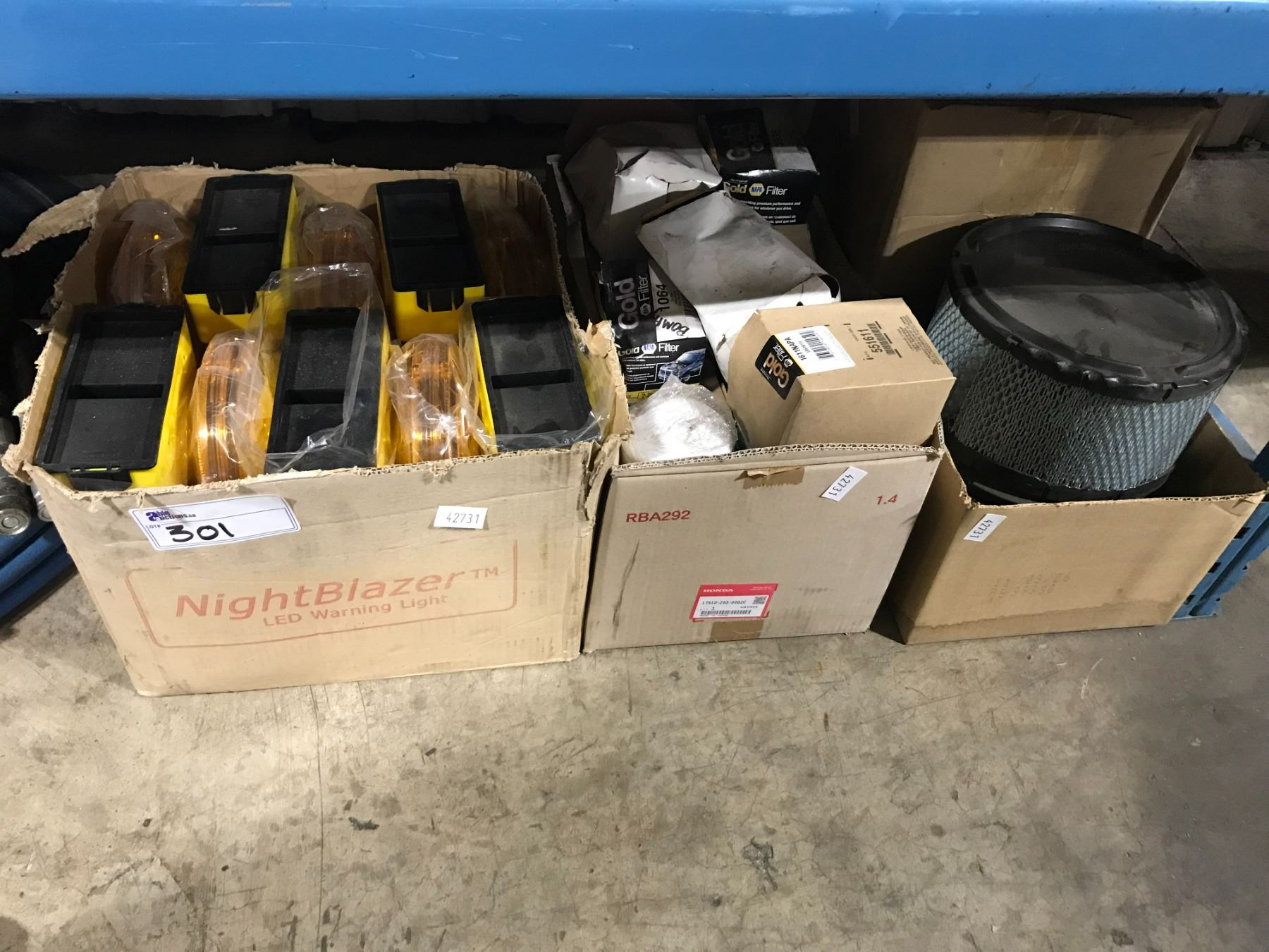 SHELF OF ASSORTED FLASHING WARNING LIGHTS FILTERS AND ASSORTED HOSES