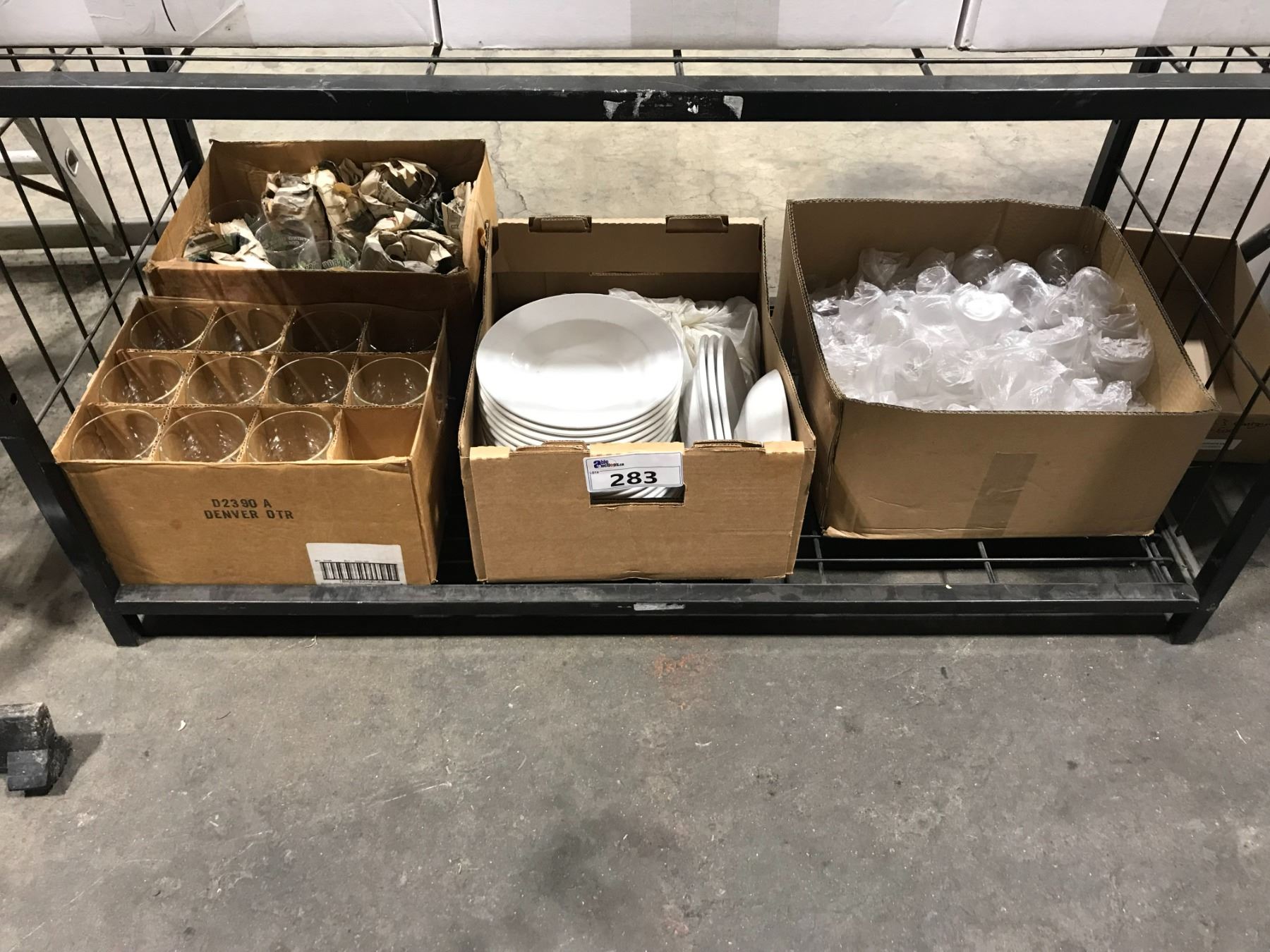 SHELF OF ASSORTED GLASSWARE, DISHWARE AND CONDIMENT DISHES