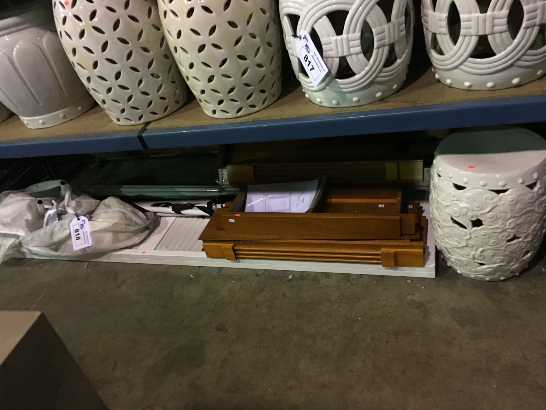 SHELF OF ASSORTED HOME IMPROVEMENT PARTS INCLUDING MANTLE PARTS AND CERAMIC GARDEN STOOL