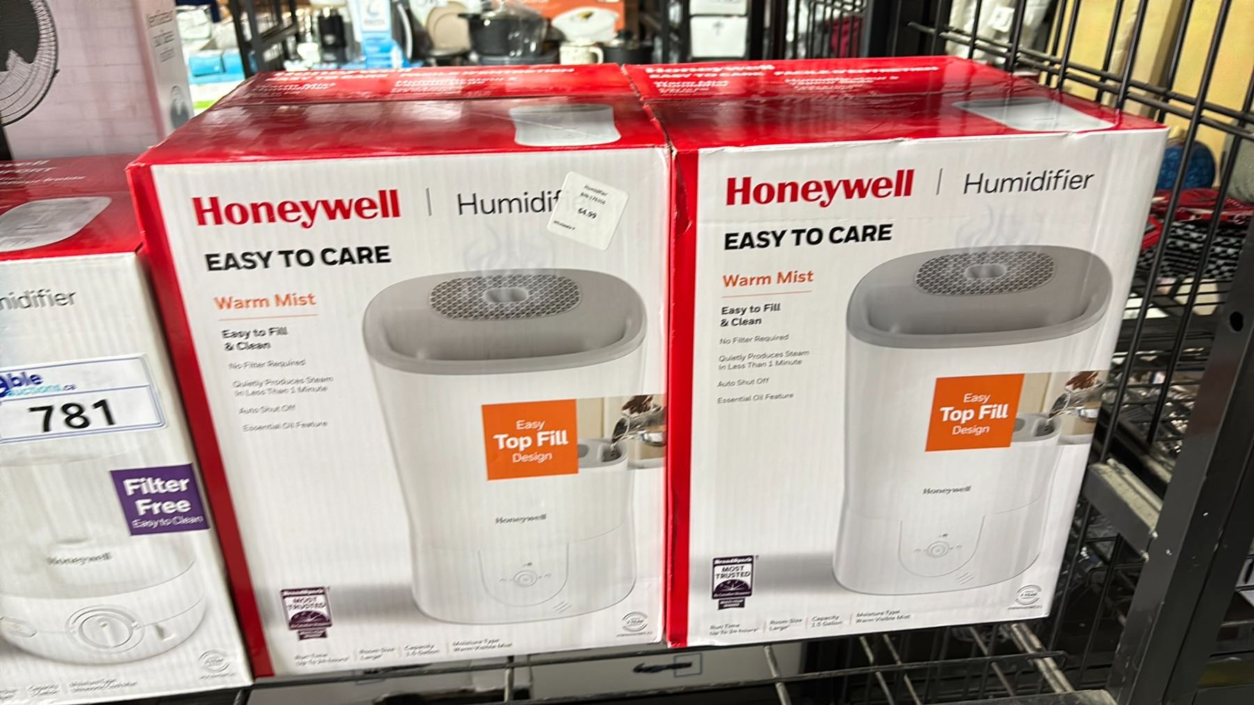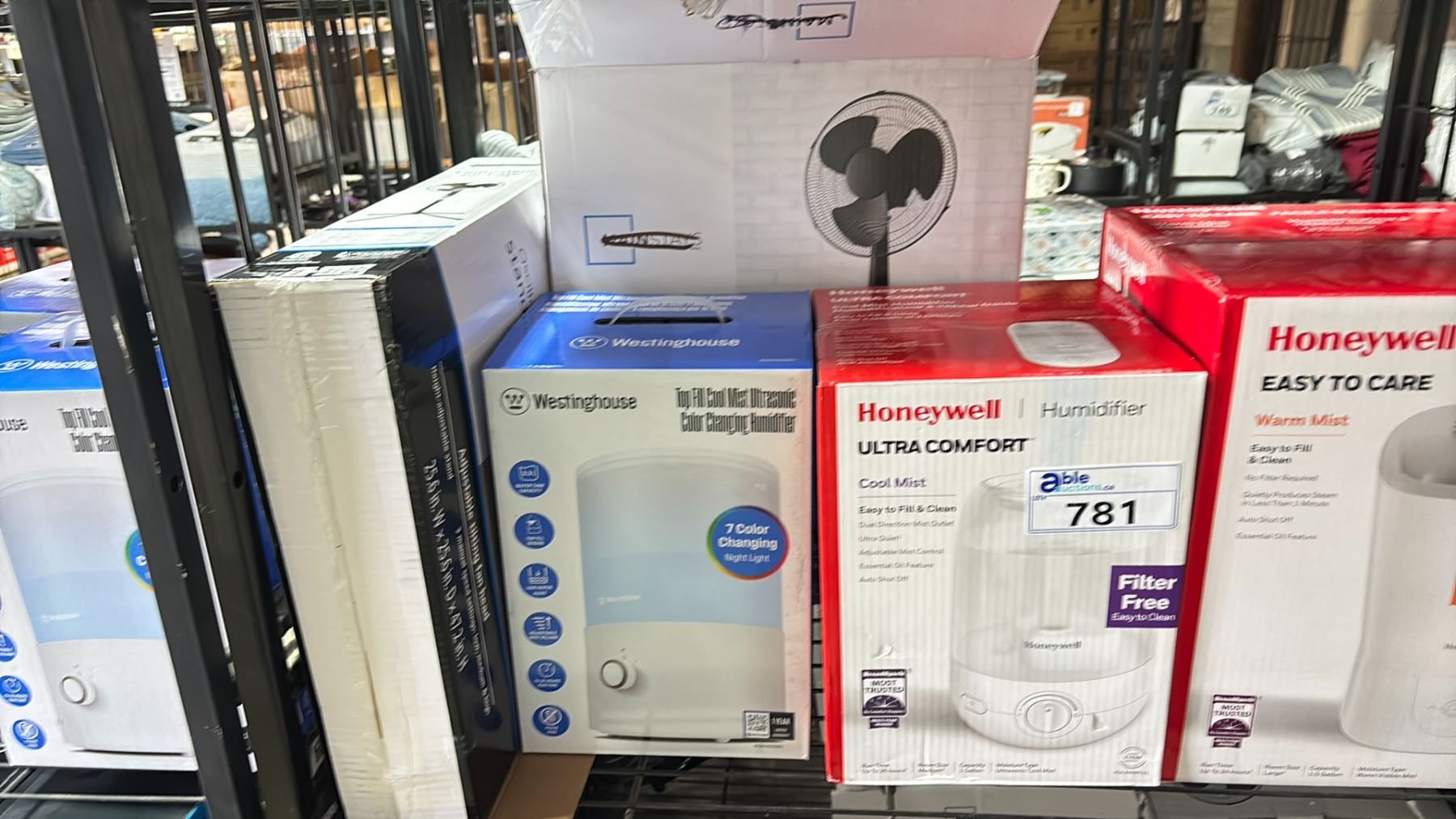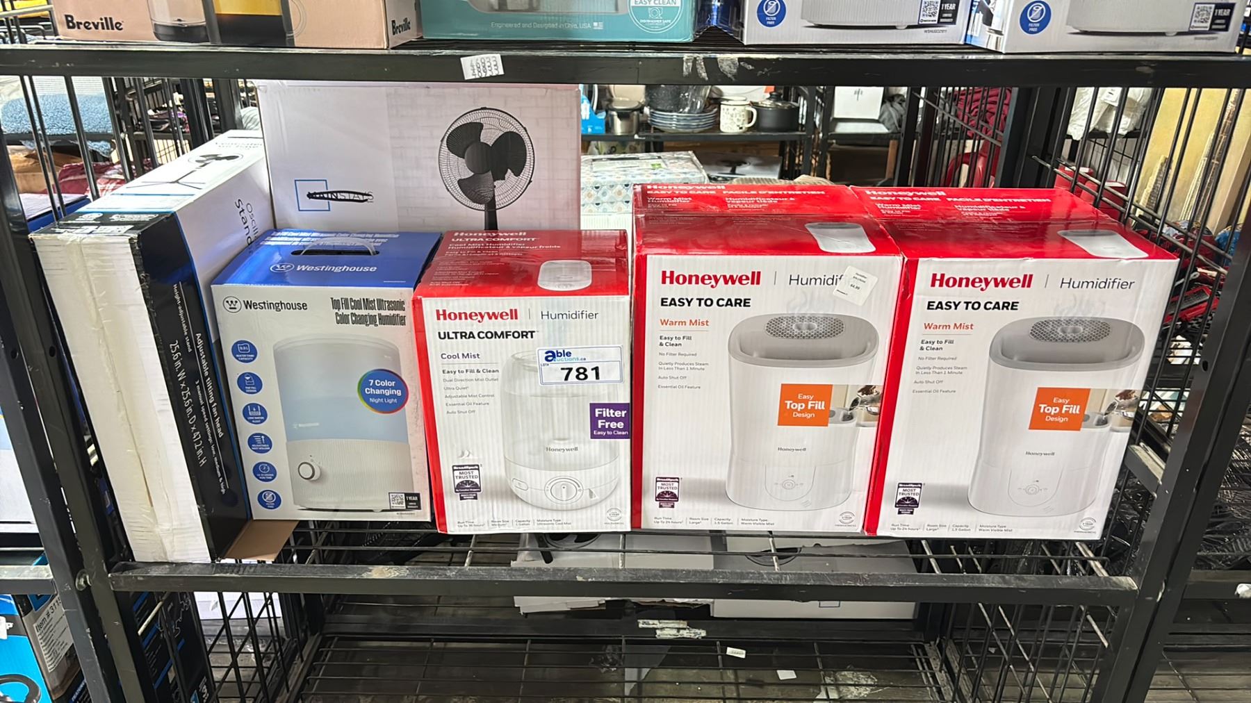 SHELF OF ASSORTED HUMIDIFIERS & OSCILLATING FANS