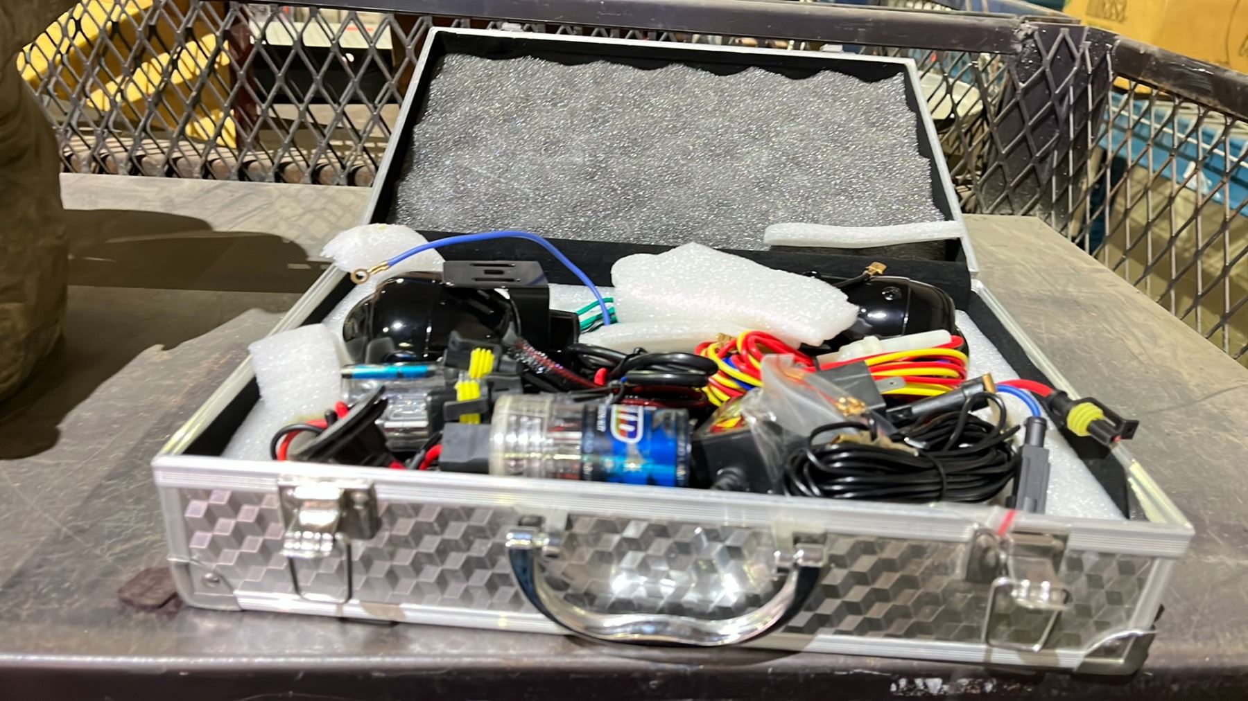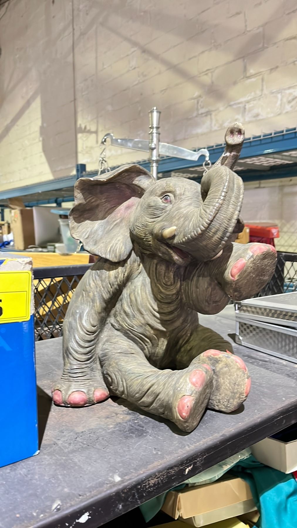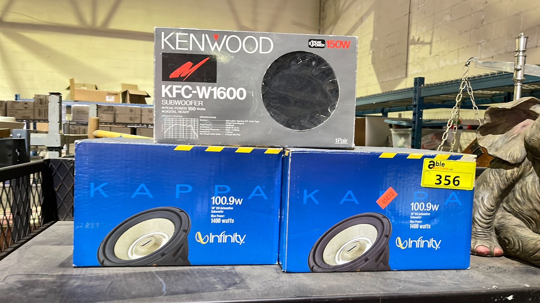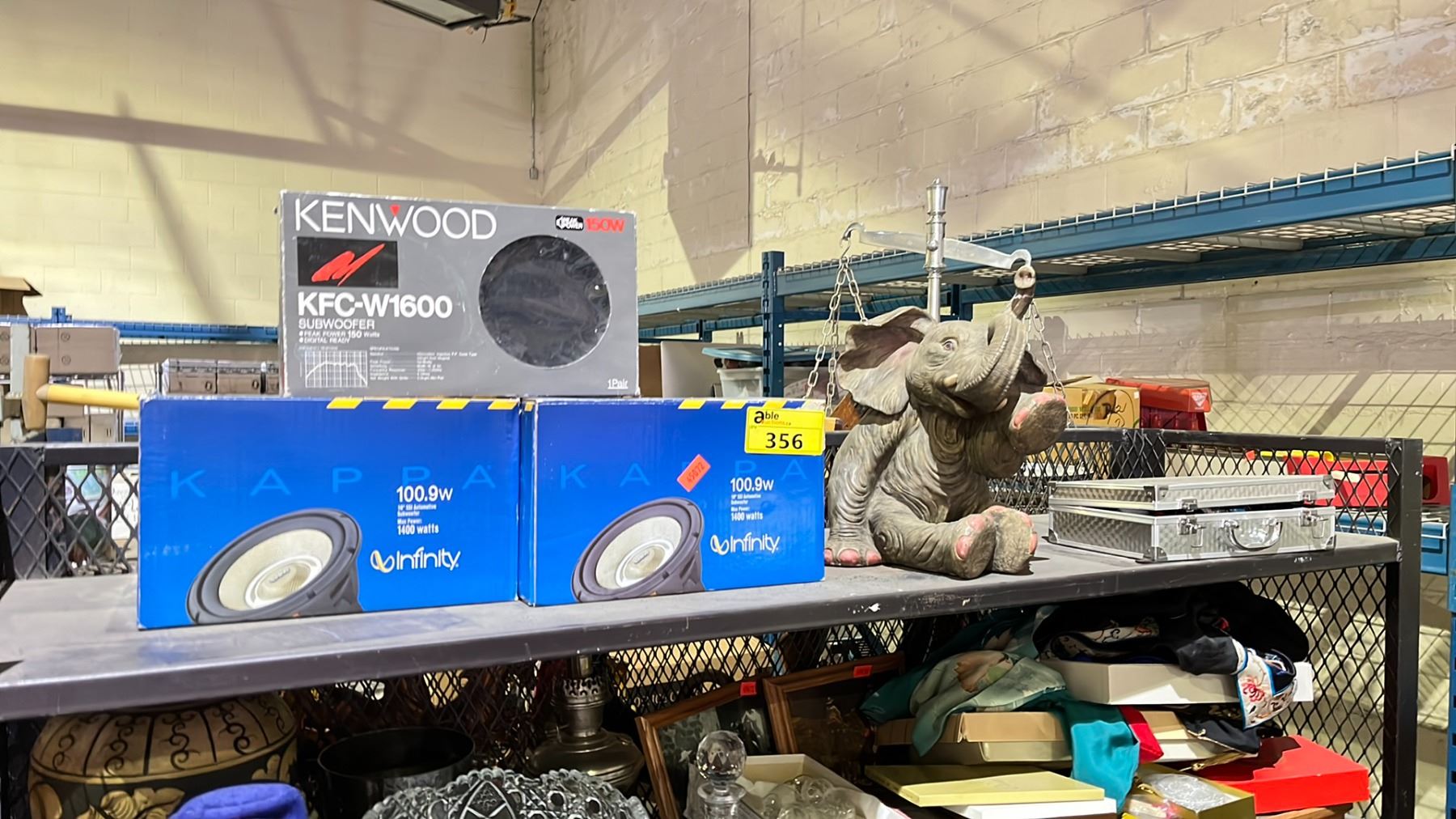 SHELF OF ASSORTED IETMS INCLUDING; SUBWOOFERS, ELEPHANT SCULPTURE & KENSUN HEADLIGHT KIT