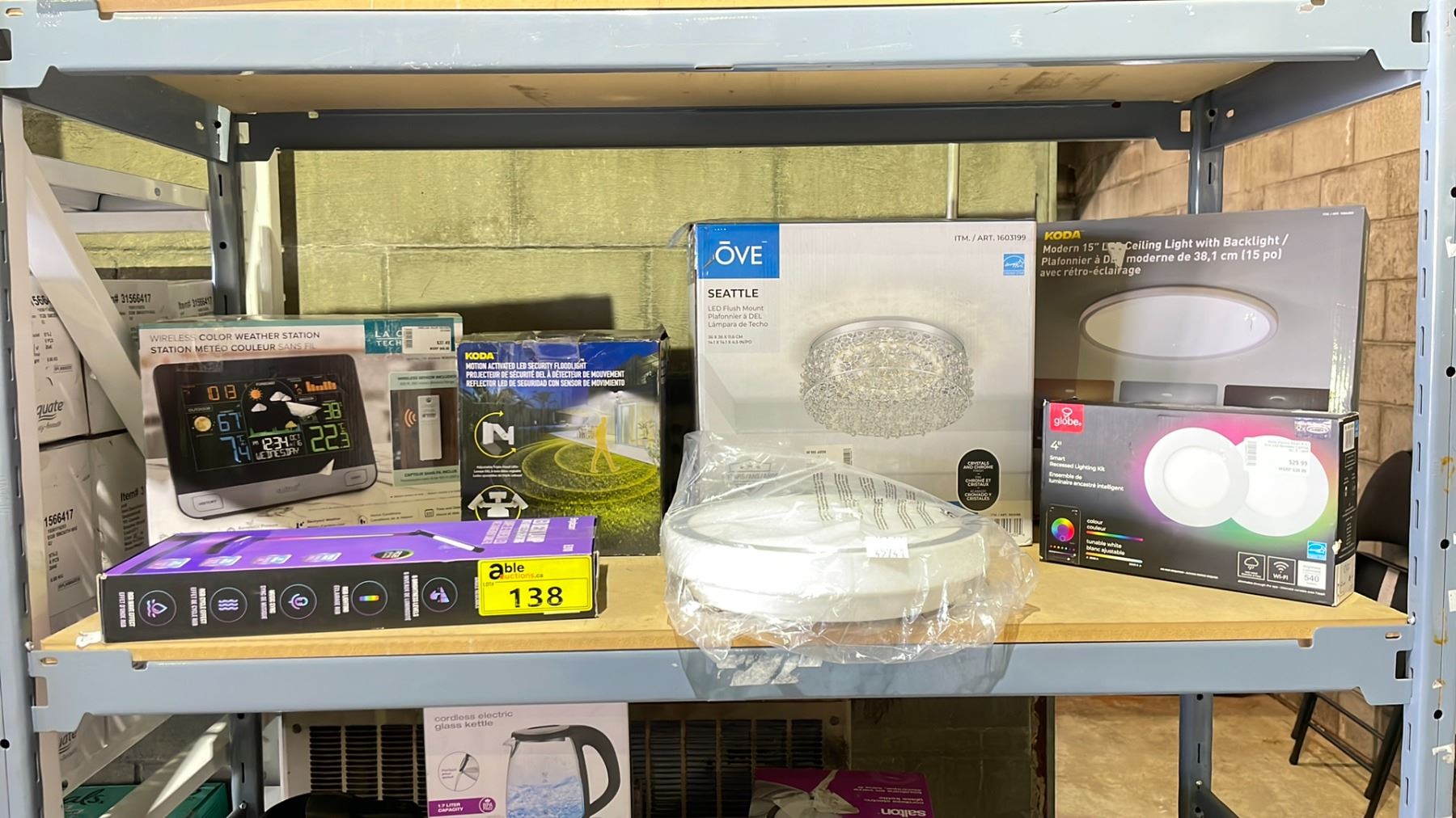 SHELF OF ASSORTED INCLUDING; WIRELESS COLOR WEATHER STATION, OVE SEATTLE LED FLUSH MOUNT, GLOBE 4" SMART RECESSED LIGHTING KIT & MORE (UNKNOWN WORKING CONDITION, MAY BE MISSING PARTS & PIECES)