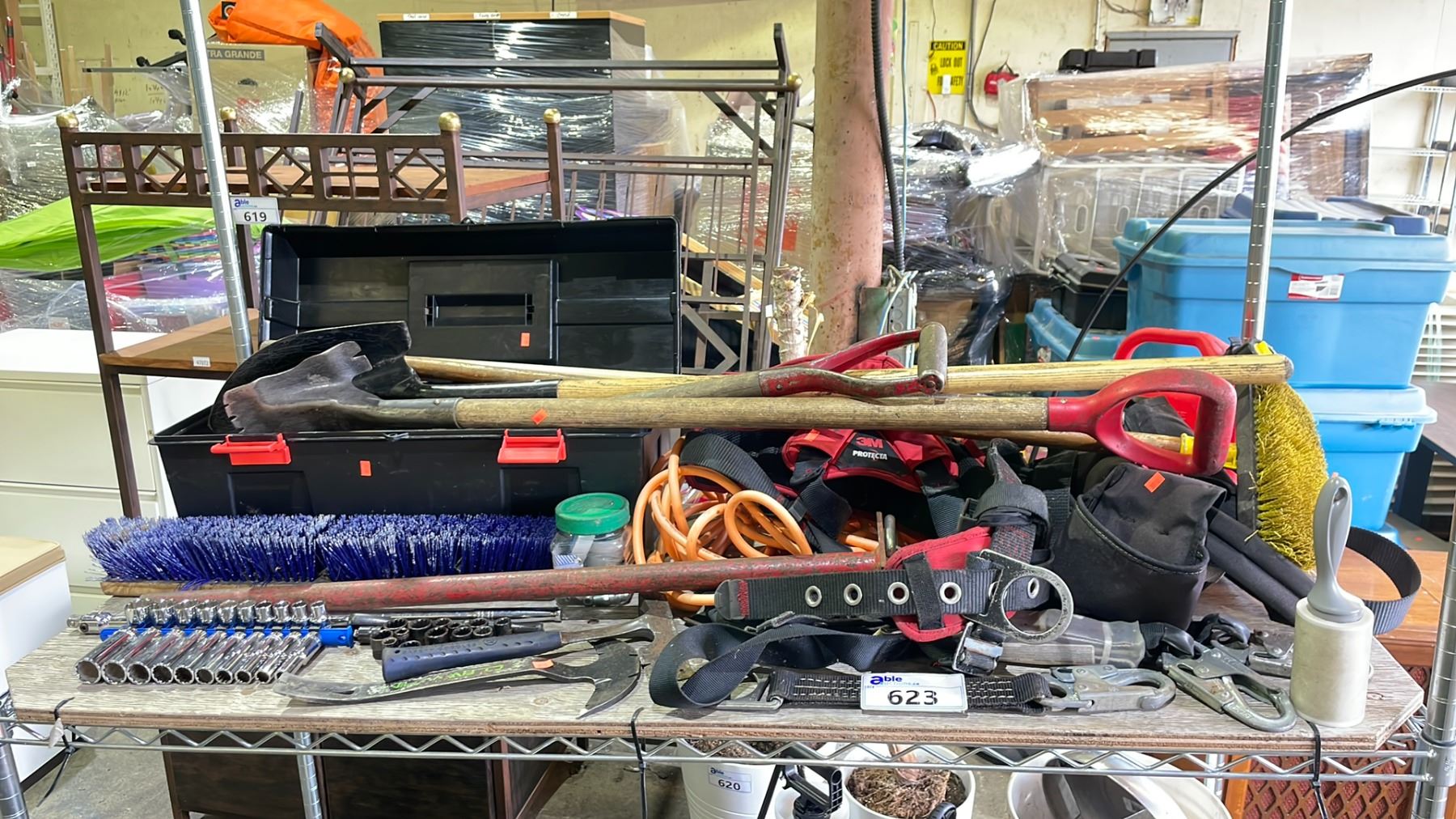 SHELF OF ASSORTED INDUSTRIAL TOOLS & SAFETY GEAR, HAND TOOLS, 3M PROTECTA HARNESS, SHOVELS, SOCKET SETS, TOOL BELT & MORE