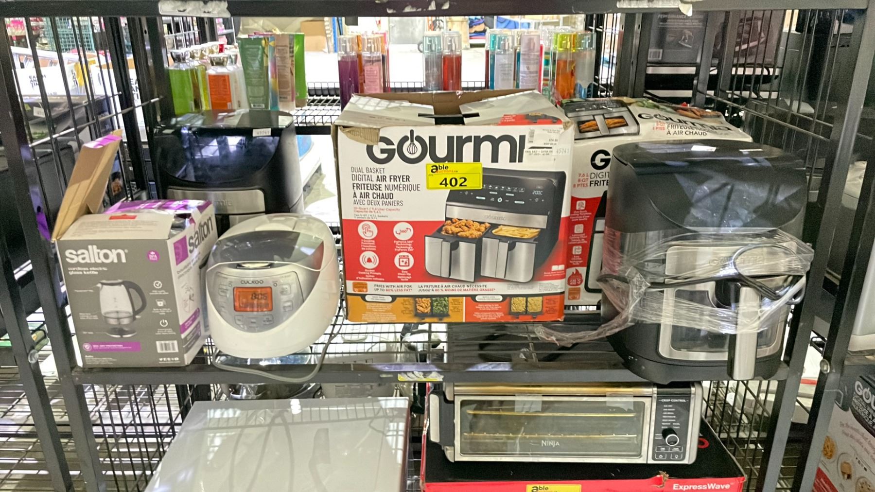 SHELF OF ASSORTED ITEMS INCLUDING; AIR FRYERS, RICE COOKER & GLASS KETTLE (UNKNOWN WORKING CONDITION, MAY BE MISSING PIECES)
