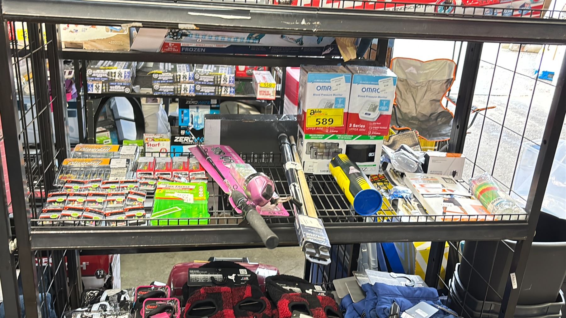 SHELF OF ASSORTED ITEMS INCLUDING; BLOOD PRESSURE MONITORS, FISHING SUPPLIES, DARTS & MORE
