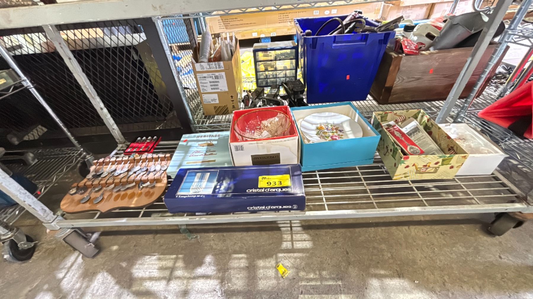 SHELF OF ASSORTED ITEMS INCLUDING; COLLECTIBLE SPOONS, CRYSTALWARE, DECORATIVE PLATES & MORE