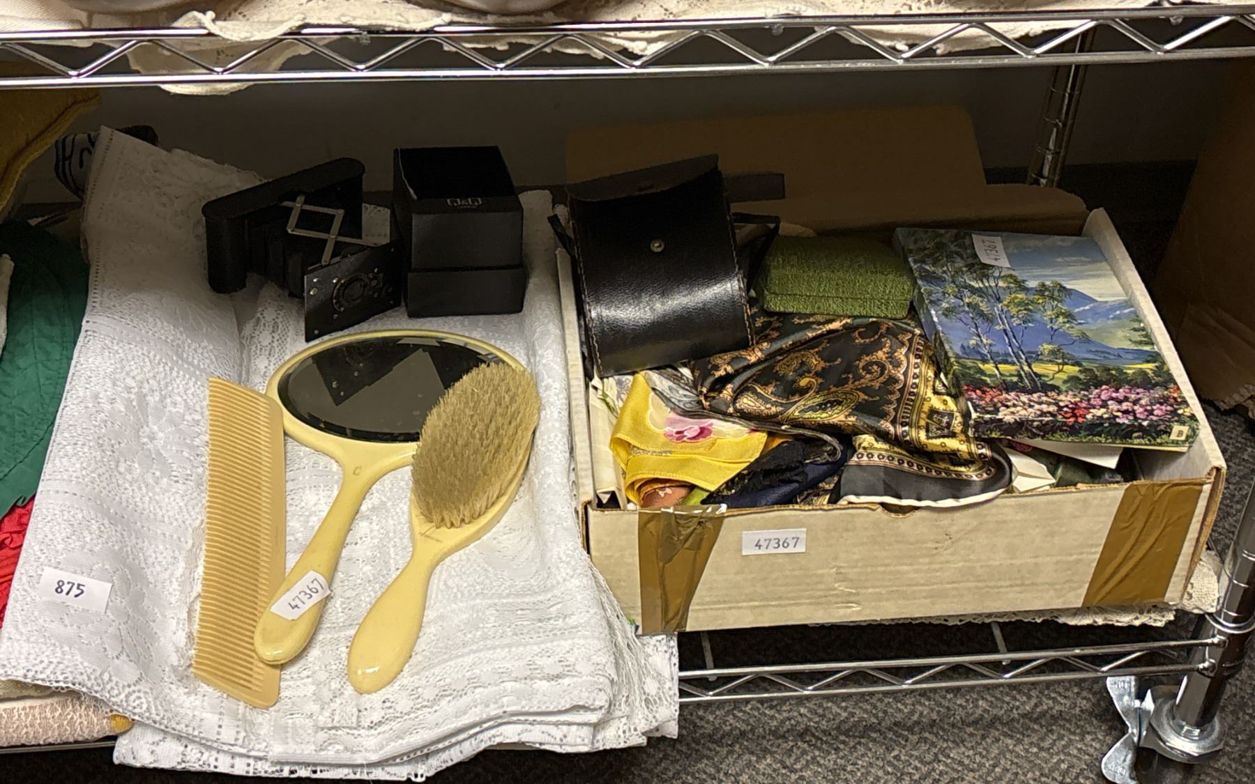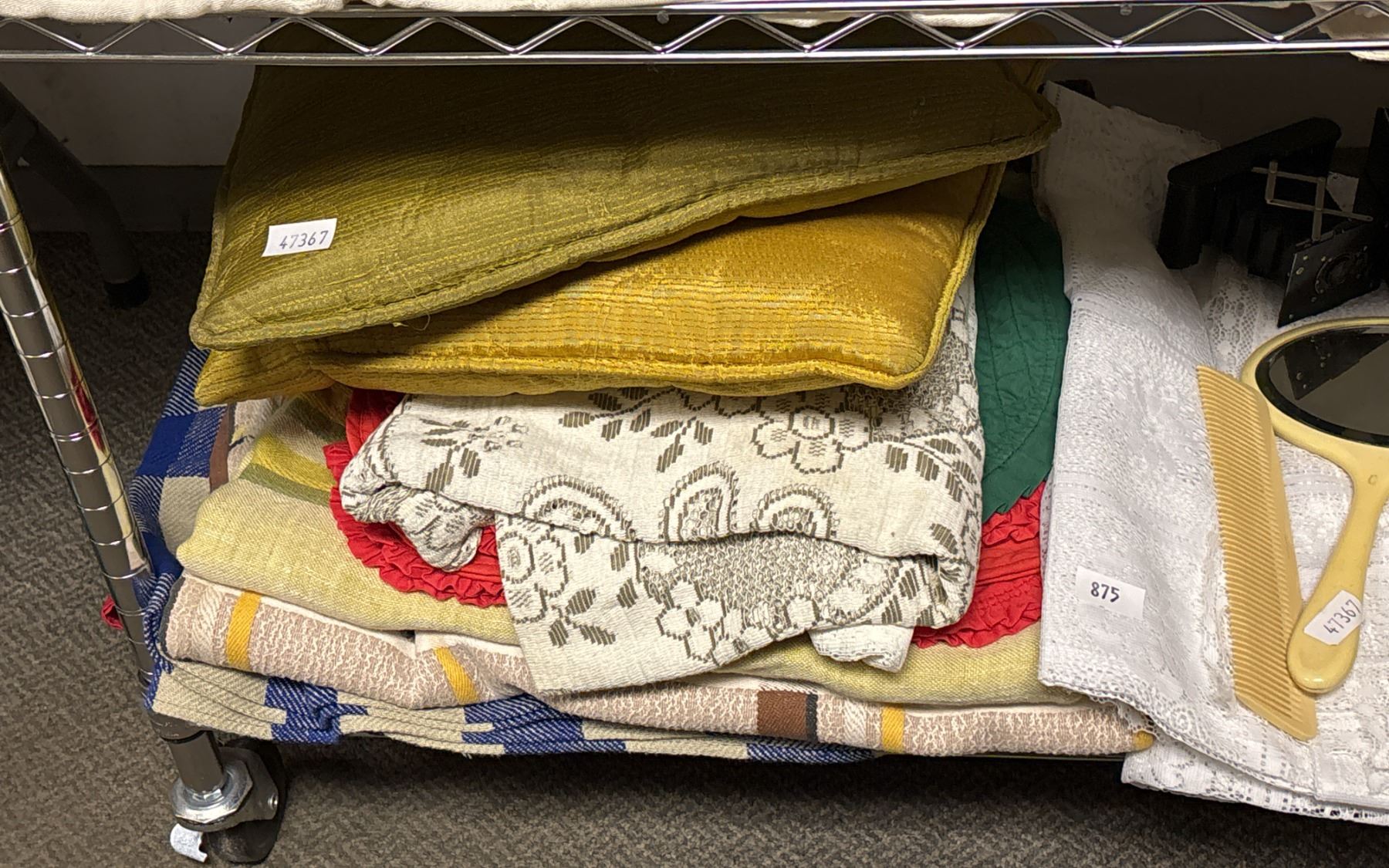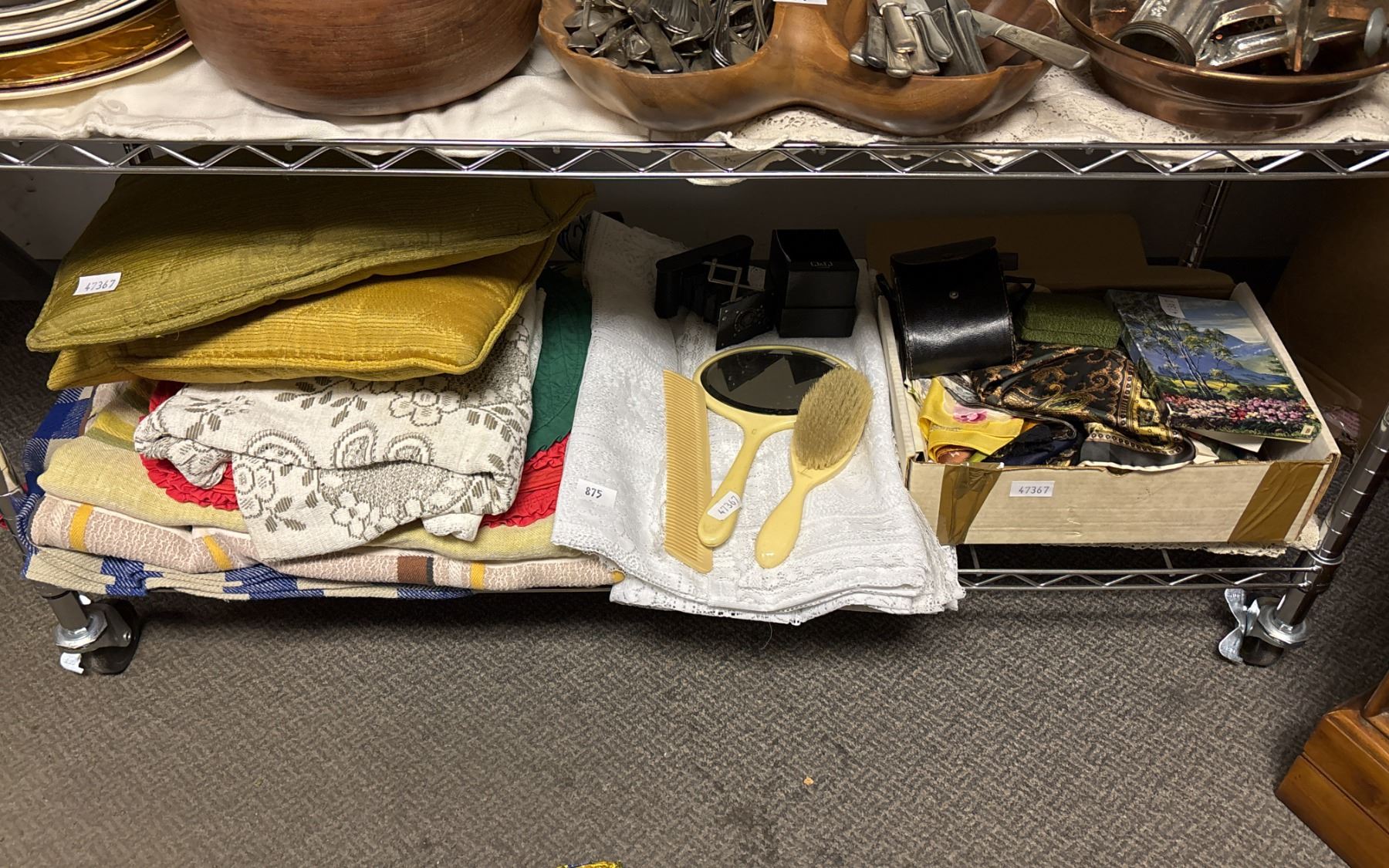 SHELF OF ASSORTED ITEMS INCLUDING; CUSHIONS, LINENS, HAIR BEAUTY SET & MORE