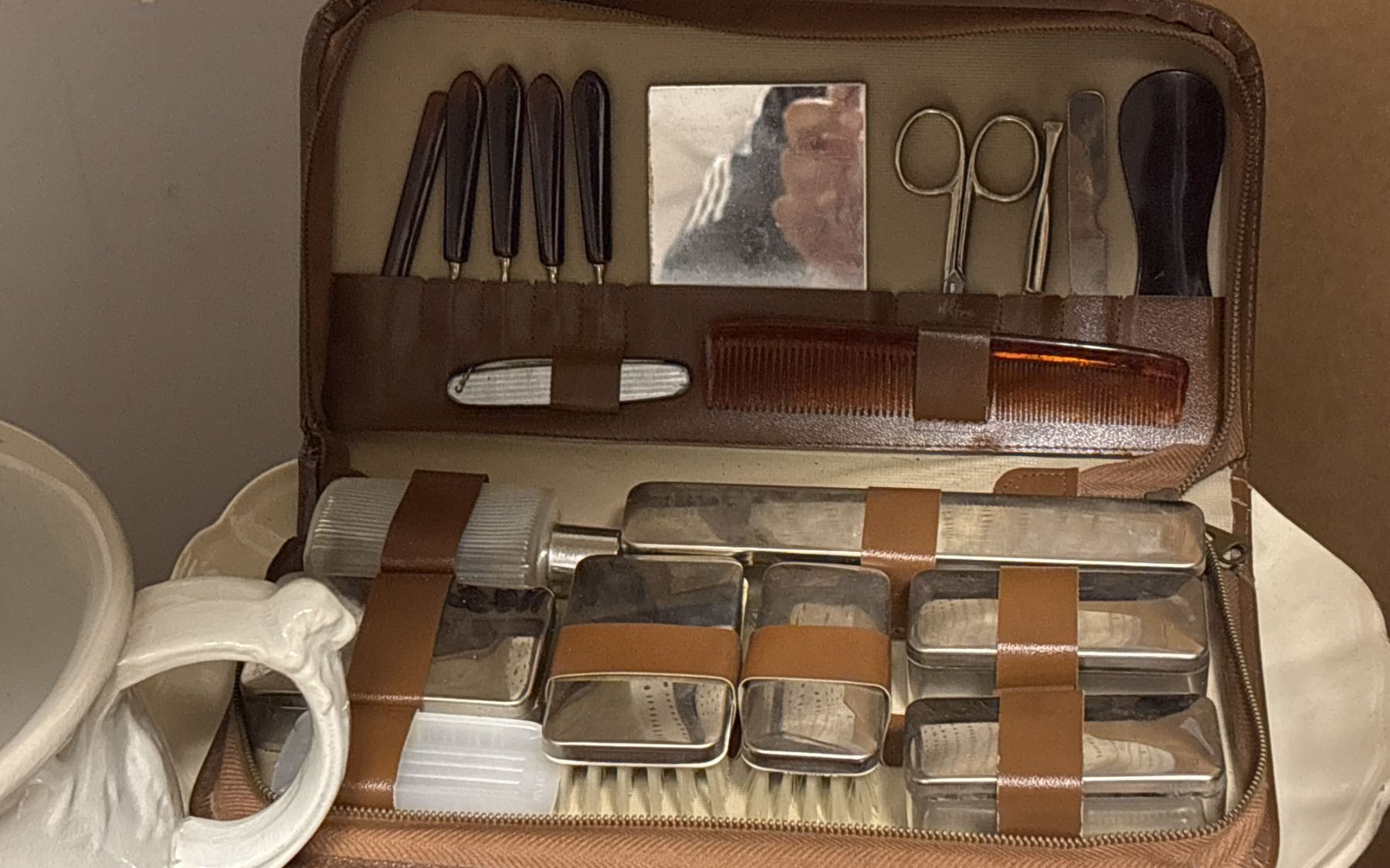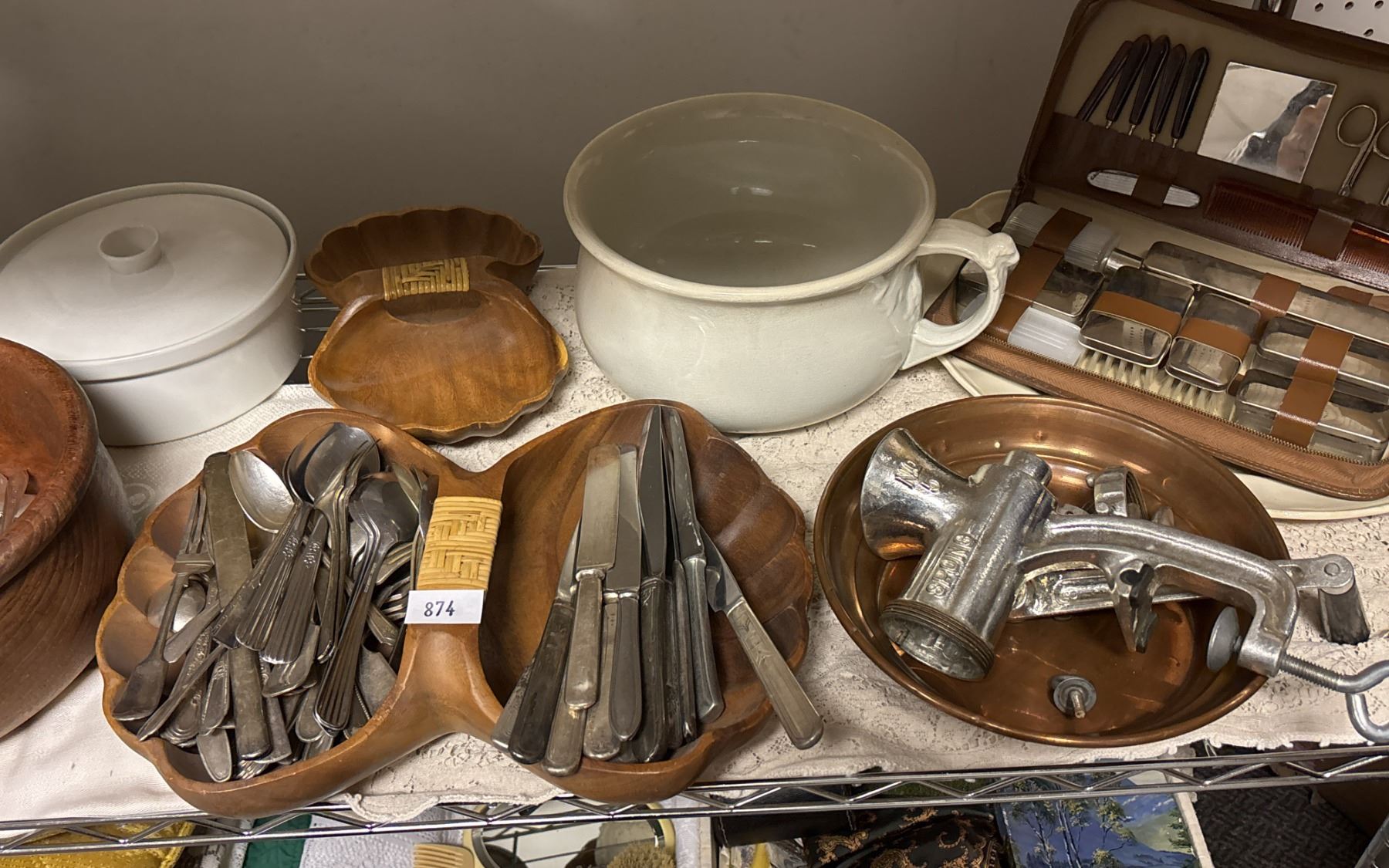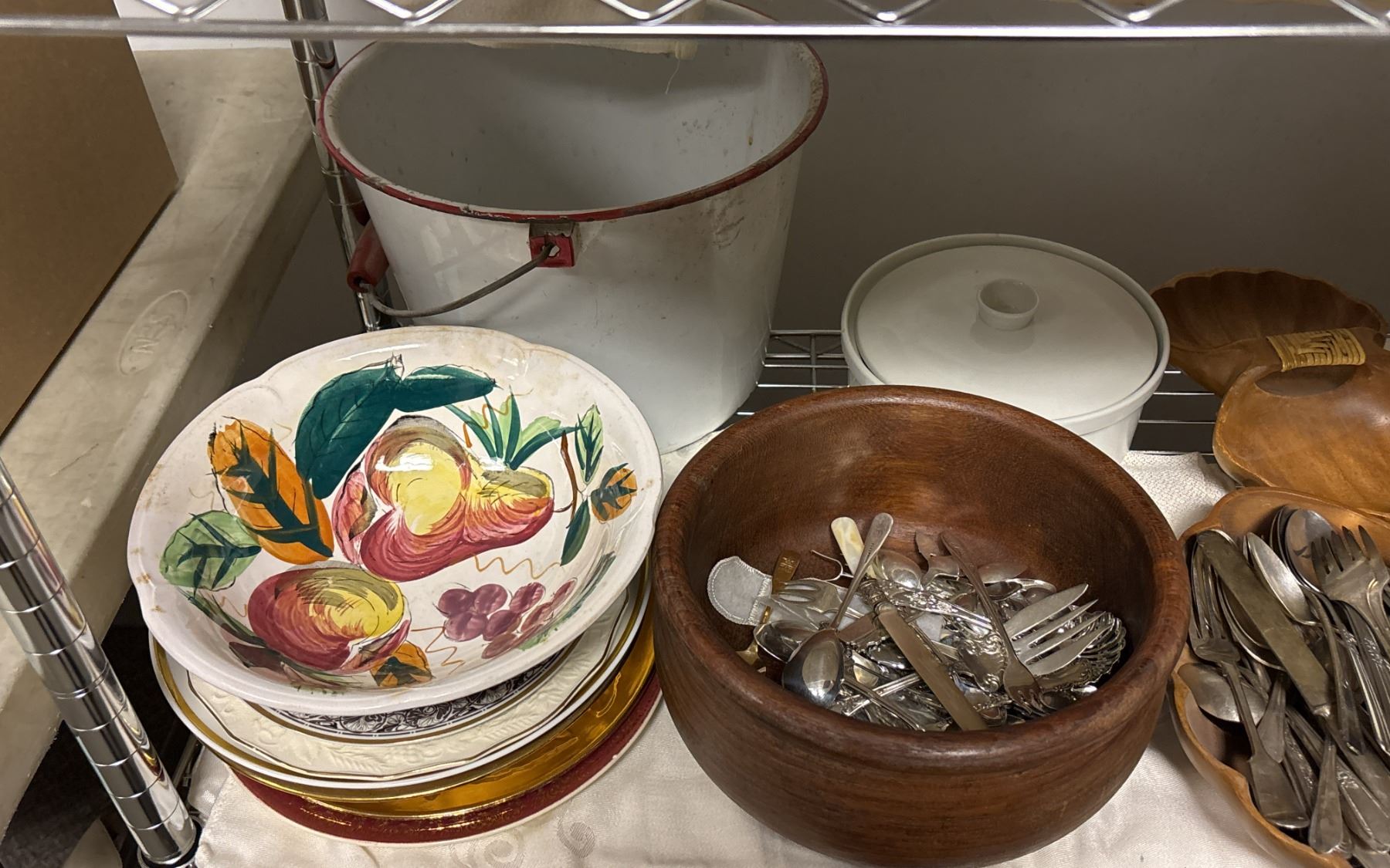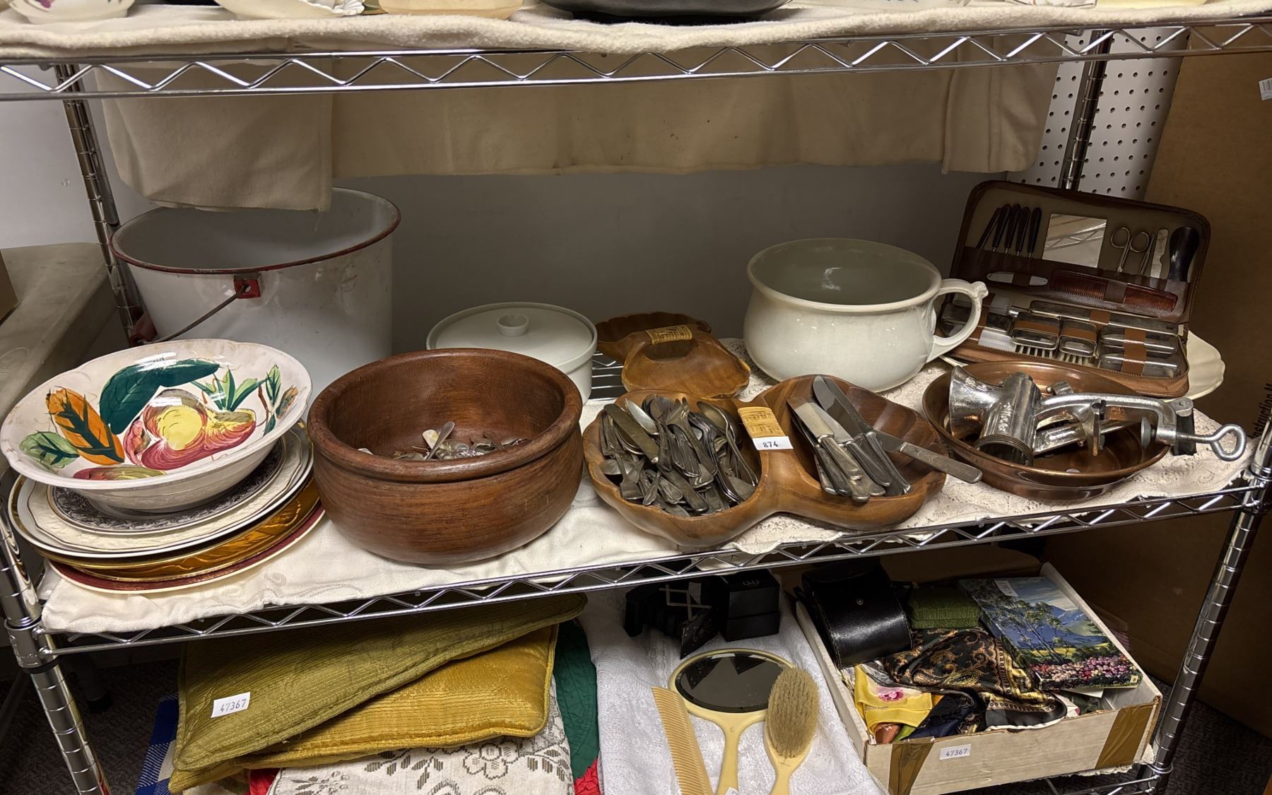 SHELF OF ASSORTED ITEMS INCLUDING; FLATWARE, DINNERWARE, VINTAGE BEAUTY KIT & MORE