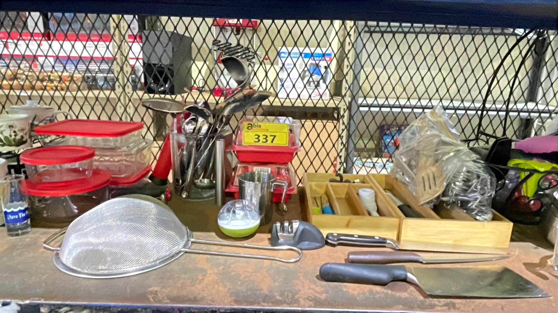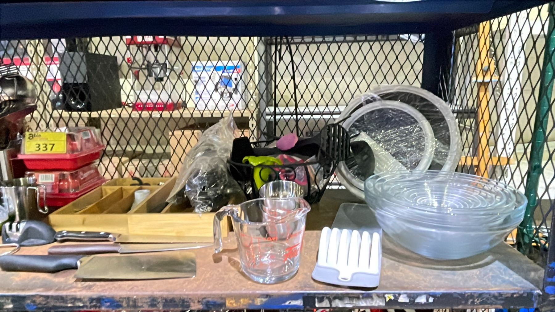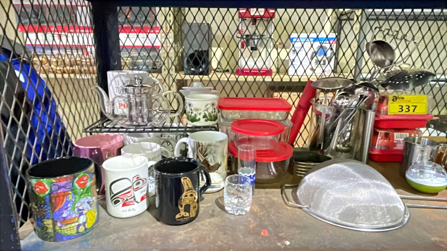 SHELF OF ASSORTED ITEMS INCLUDING; GLASS BOWL SET, PYREX CONTAINERS, MUGS & MORE