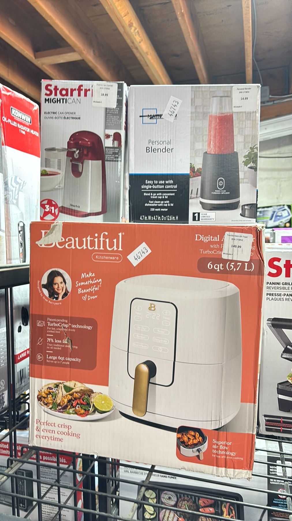 SHELF OF ASSORTED ITEMS INCLUDING; HAMILTON BEACH 700W MICROWAVE OVEN, STARFRIT PANINI GRILL WITH REVERSIBLE PLATES, BEAUTIFUL KITCHENWARE DIGITAL AIR FRYER AND MORE