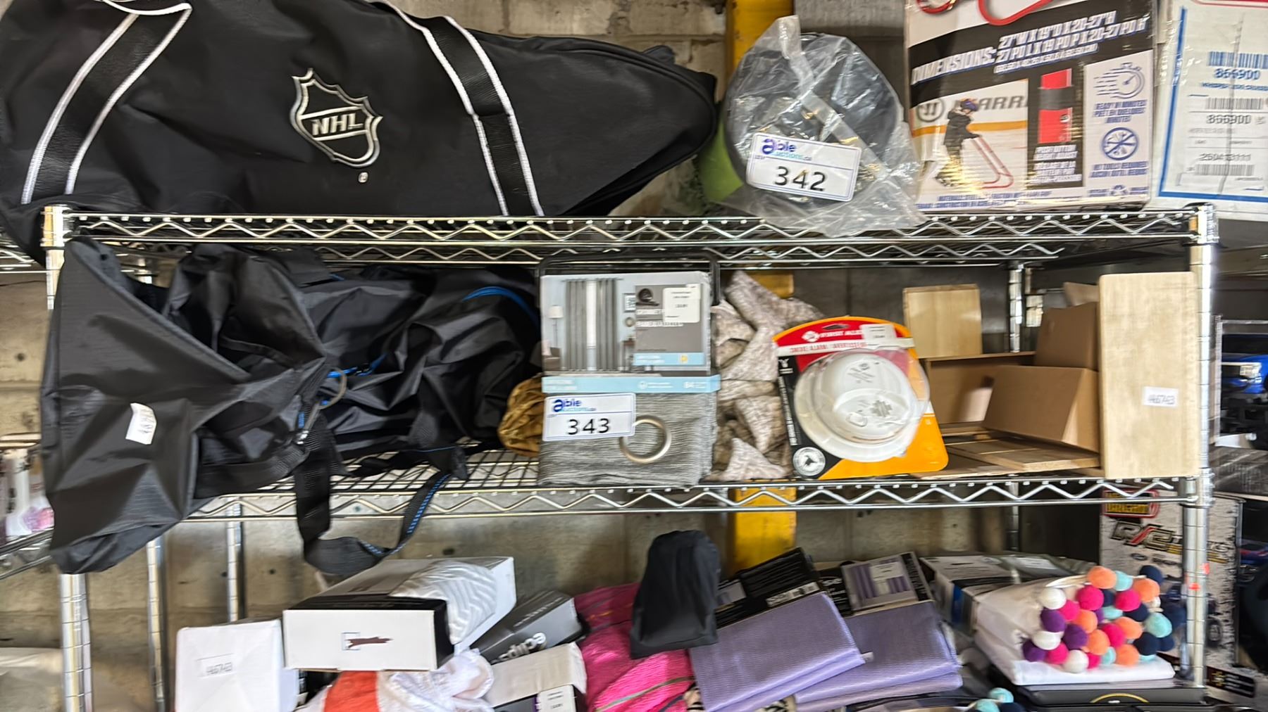 SHELF OF ASSORTED ITEMS INCLUDING; JUNIOR HOCKEY BAG, GROMMET PANEL CURTAINS, SMOKE ALARM & MORE\