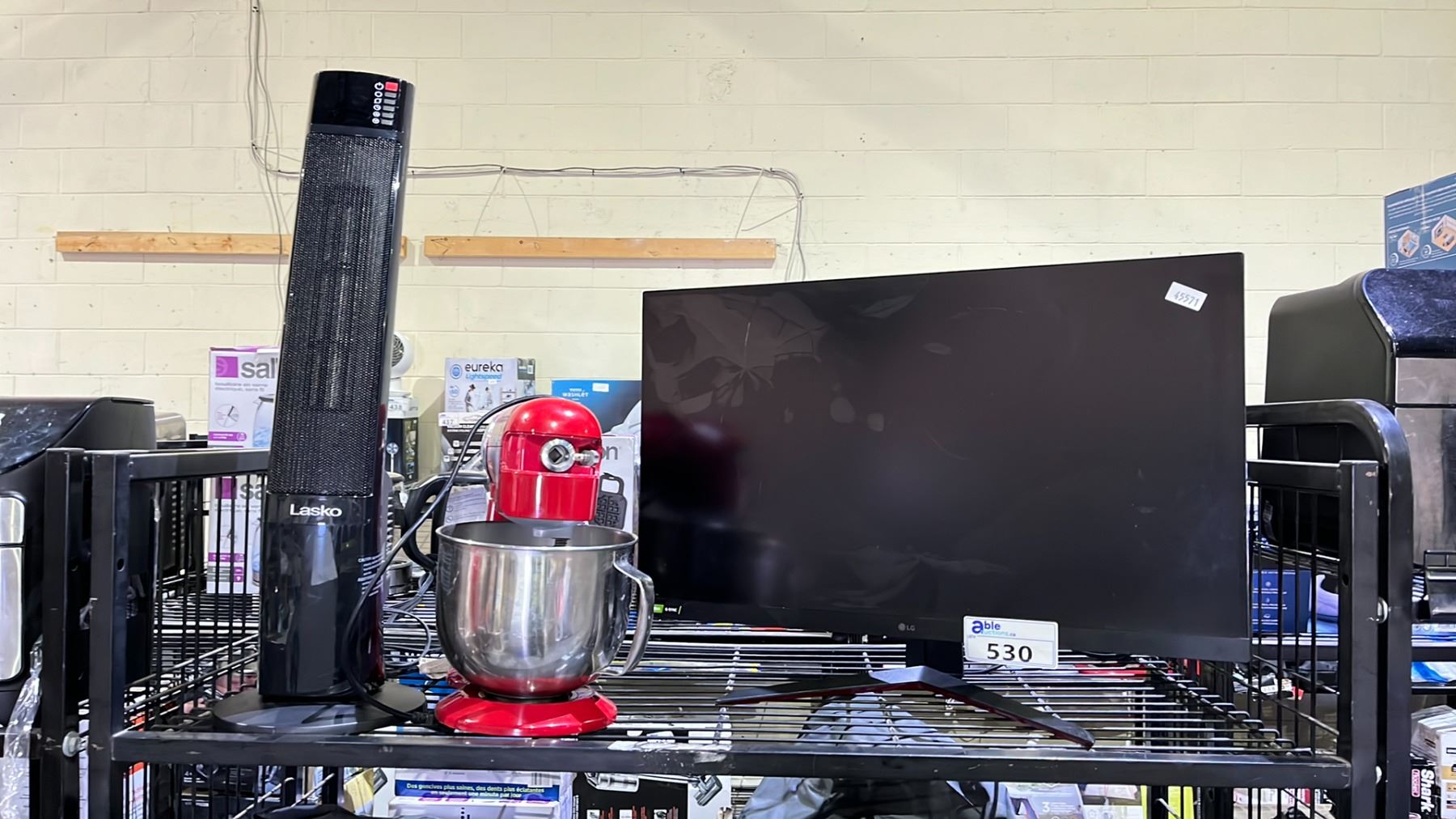 SHELF OF ASSORTED ITEMS INCLUDING; LG ULTRAGEAR 32" MONITOR (DAMAGED, NO POWER CORD), KITCHENAID STAND MIXER & LASKO HEATER (UNKNOWN WORKING CONDITION)