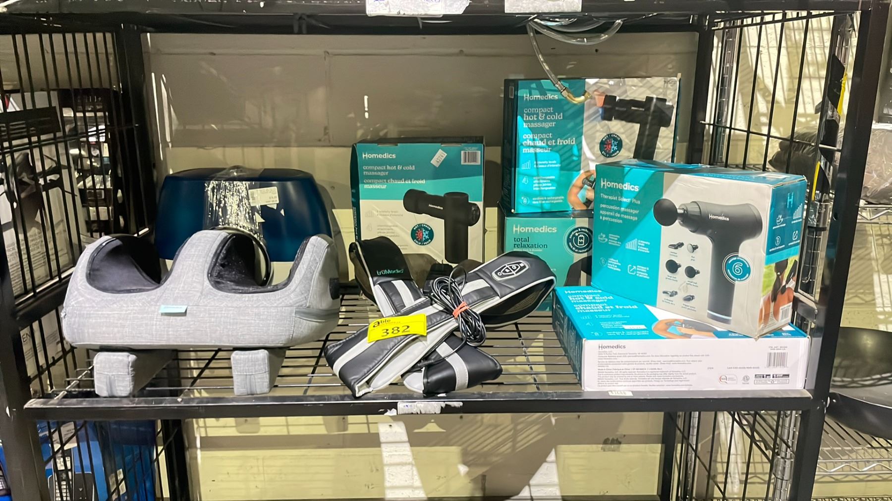 SHELF OF ASSORTED ITEMS INCLUDING; MASSAGERS & DEHUMIDIFIER (UNKNOWN WORKING CONDITION, MAY BE MISSING PIECES)