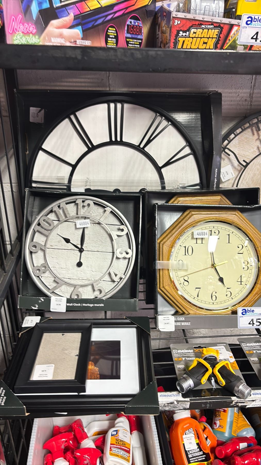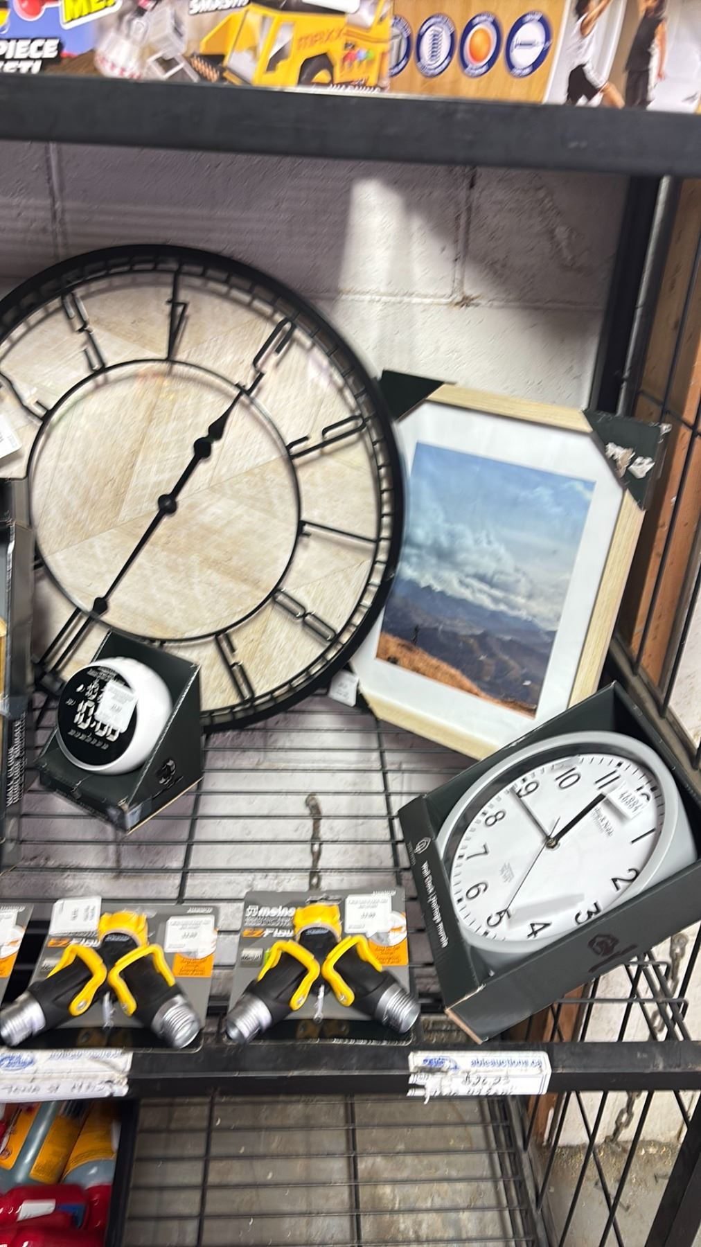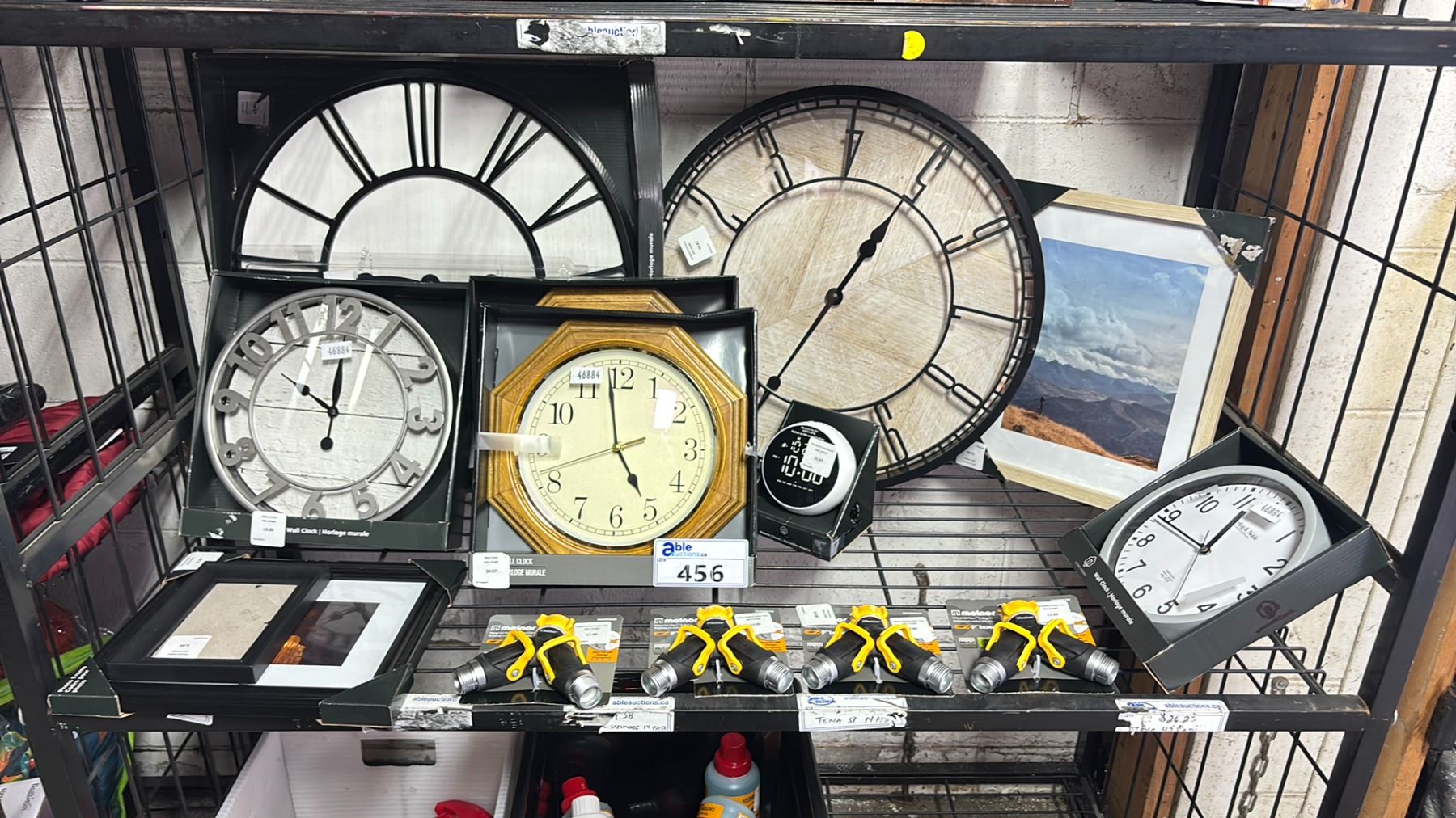 SHELF OF ASSORTED ITEMS INCLUDING; METAL EZFLOW 2-WAY CONTROL VALVES, WALL CLOCKS & PICTURE FRAMES