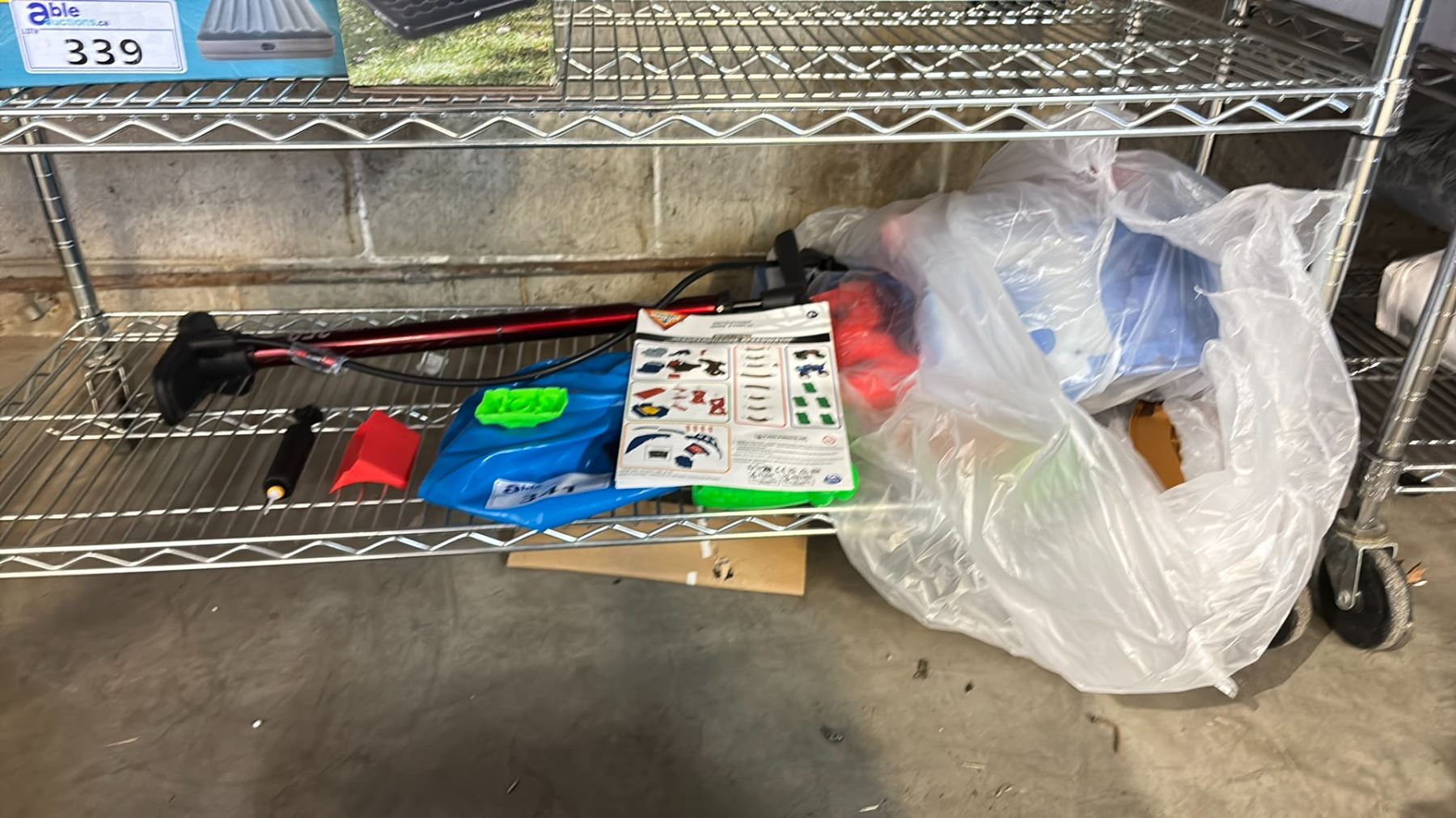 SHELF OF ASSORTED ITEMS INCLUDING; MONSTER JAM SUPERCHARGE SPEEDWAY, BIKE PUMP & MORE