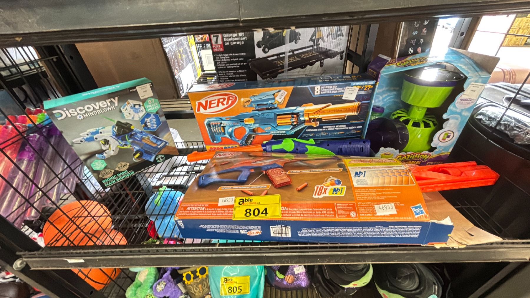 SHELF OF ASSORTED ITEMS INCLUDING; NERF GUNS, BIONIC HAND & GAZILLION BUBBLES MACHINE