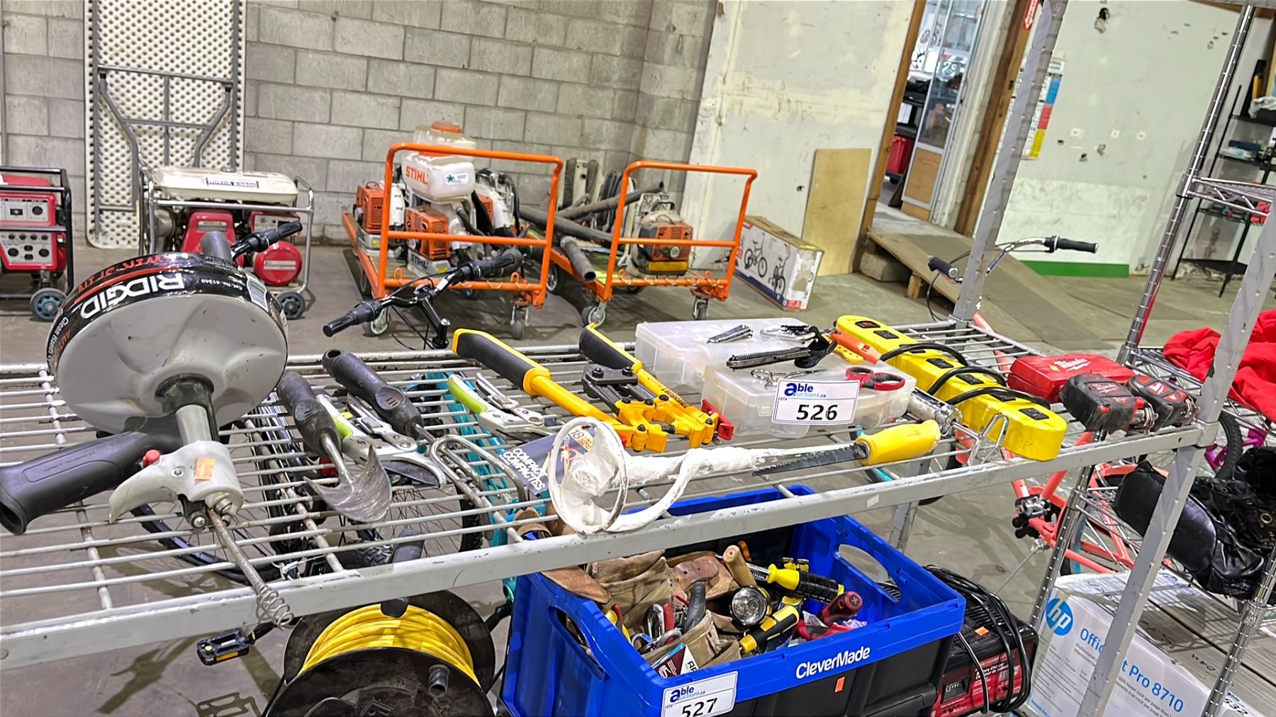 SHELF OF ASSORTED ITEMS INCLUDING; RIDGID KWIK-SPIN, FOLDING 18" BOLT CUTTERS, EXTENSION CORD & MORE