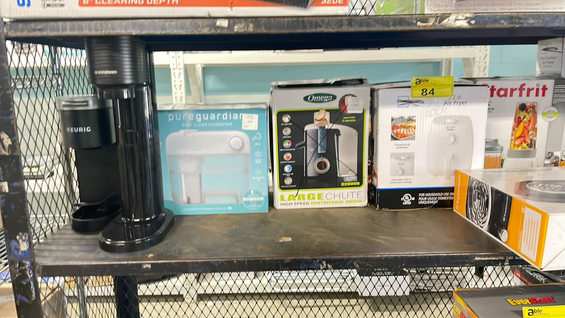SHELF OF ASSORTED ITEMS INCLUDING; SODASTREAM, PUREGUARDIAN EASY CLEAN HUMIDIFER, MAINSTAYS OSCILLATING STAND FAN & MORE