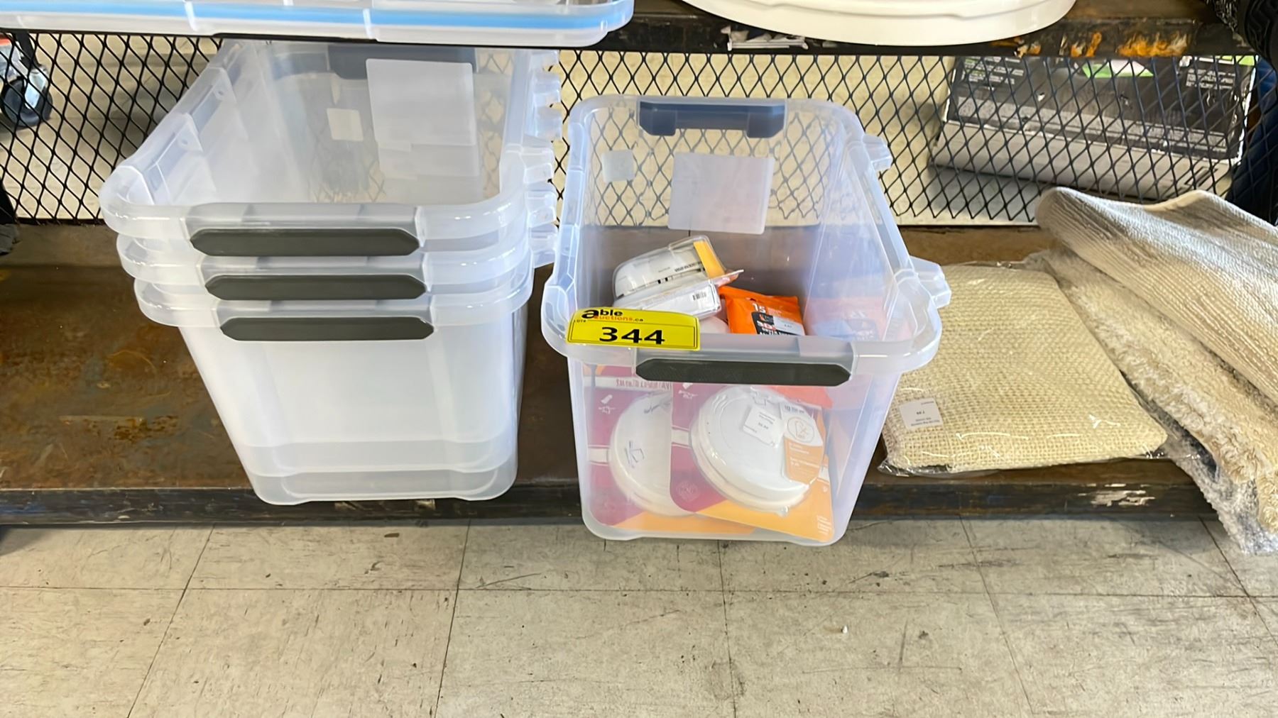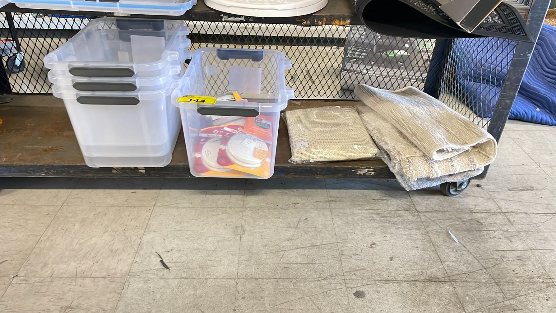 SHELF OF ASSORTED ITEMS INCLUDING; STORAGE TOTES, HONEYWELL HUMIDIFIER, BATH MAT & MORE