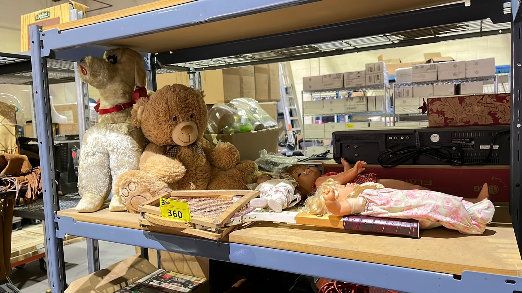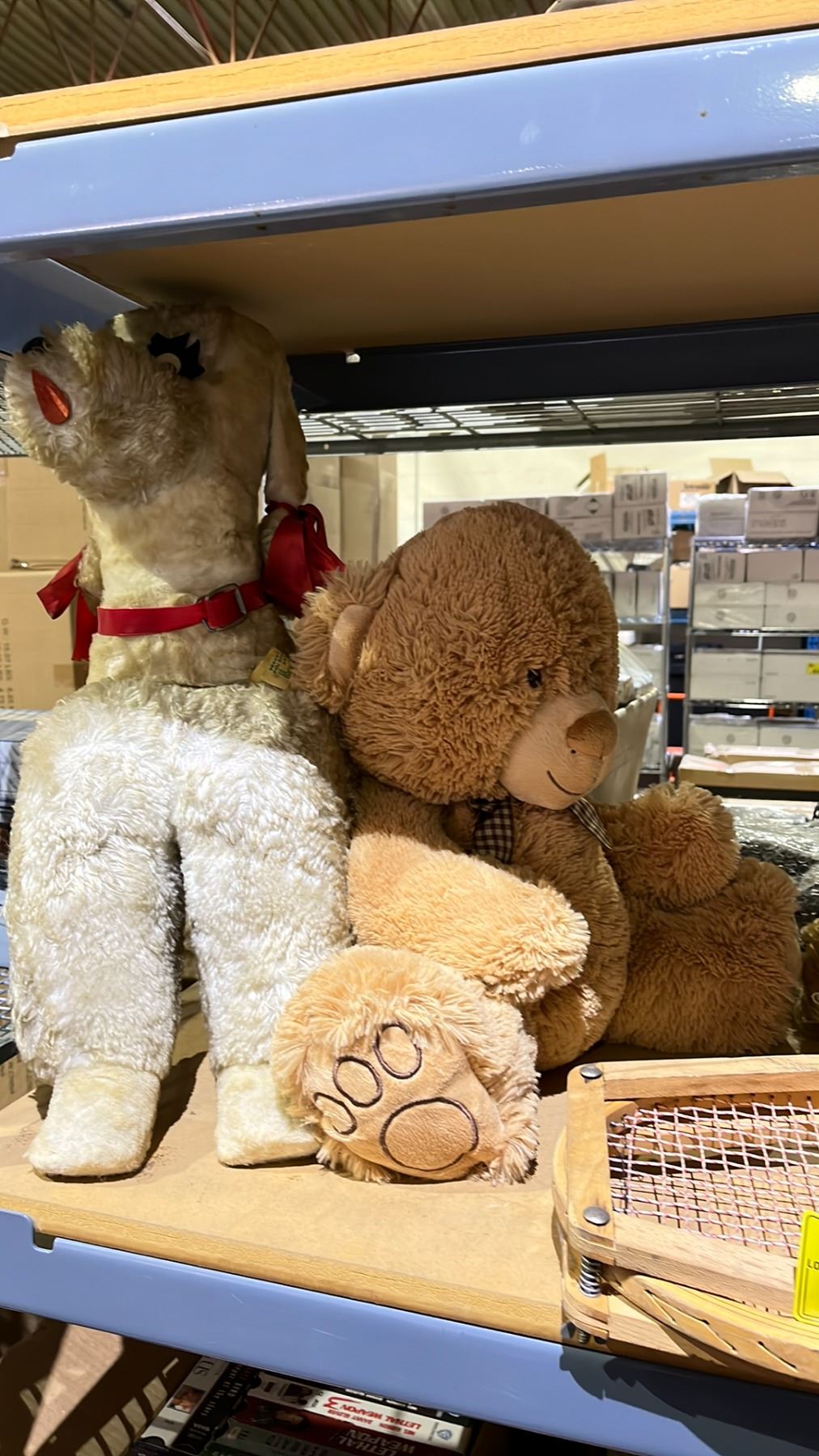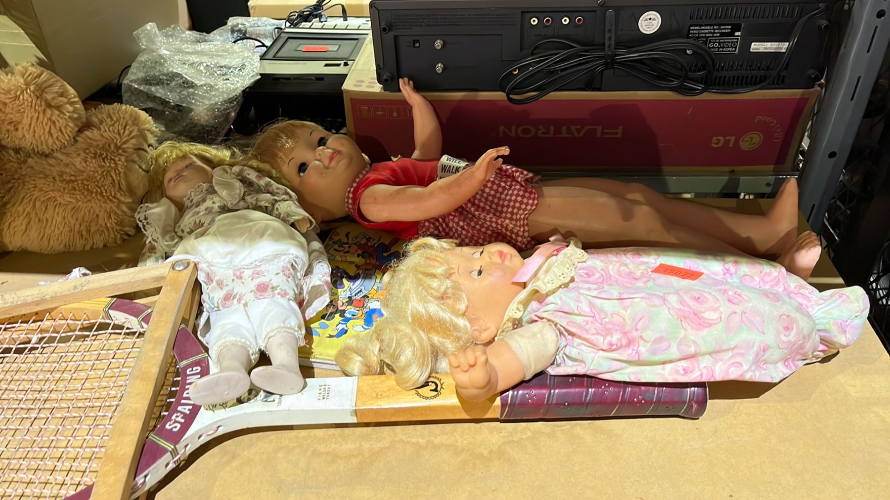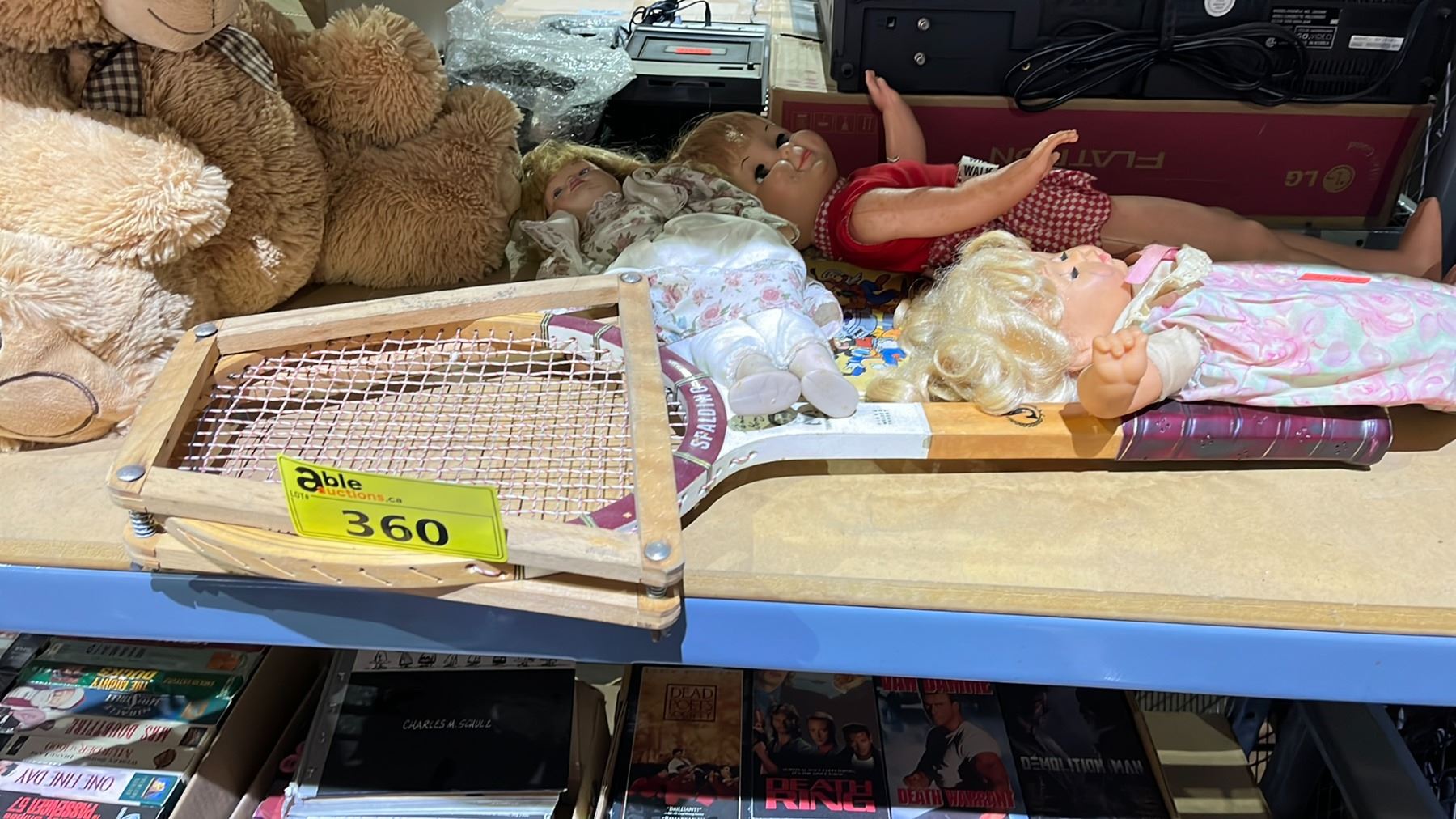 SHELF OF ASSORTED ITEMS INCLUDING; STUFFED ANIMALS, VINTAGE BADMINTON RACKET & DOLLS
