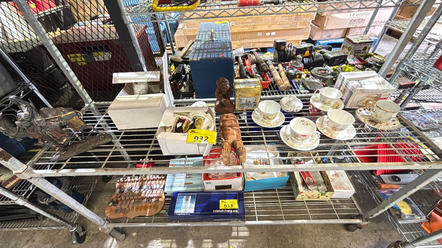 SHELF OF ASSORTED ITEMS INCLUDING; TUAREO MAN ON CAMEL DECOR, BONE CHINA CUPS & SAUCERS, CARVED WOOD DECOR & MORE