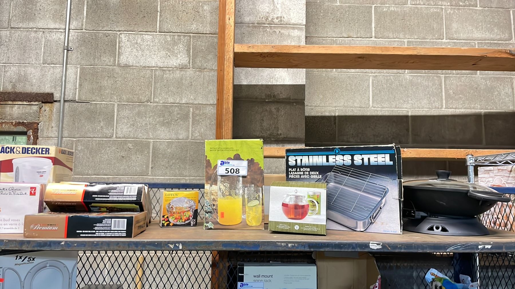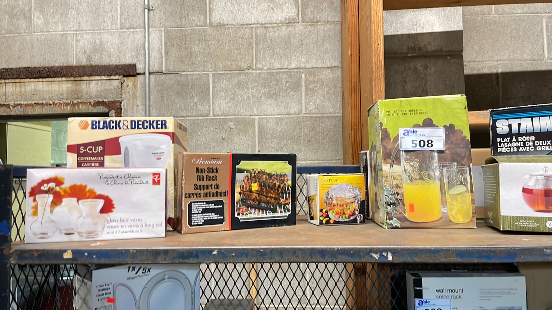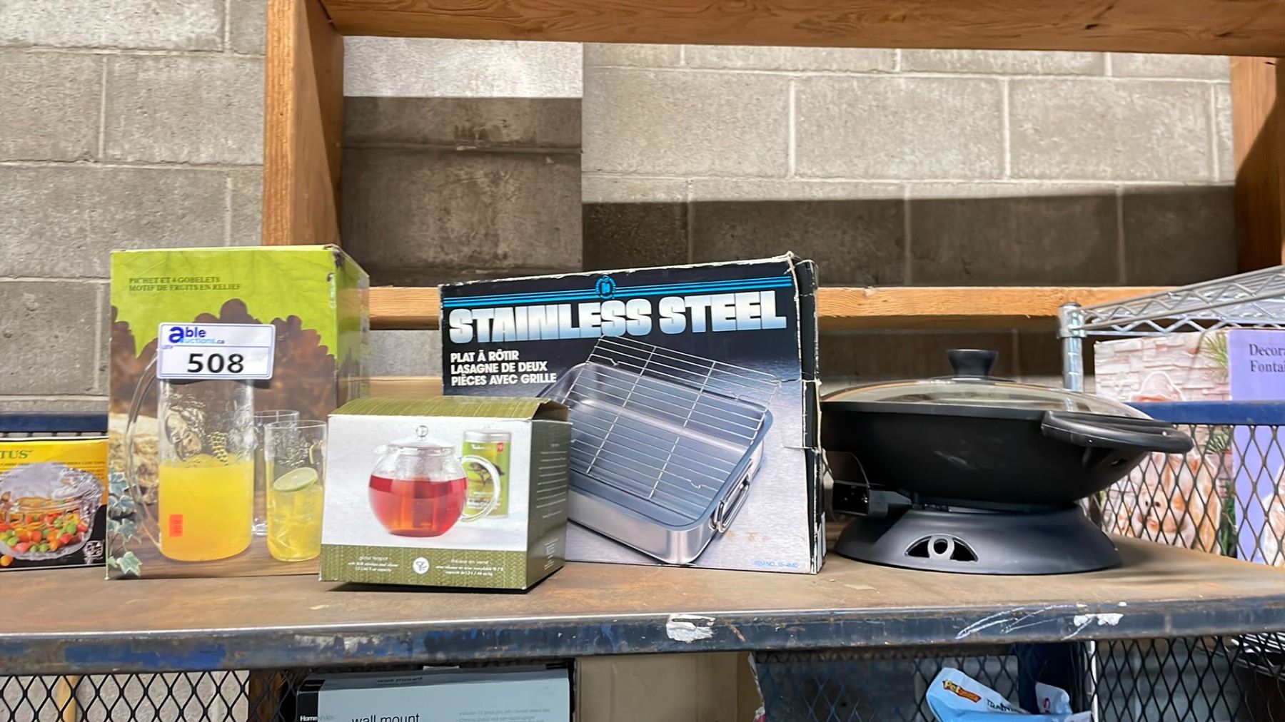 SHELF OF ASSORTED KITCHEN ITEMS, INCLUDING; SERVING PLATES, PITCHERS, & MORE