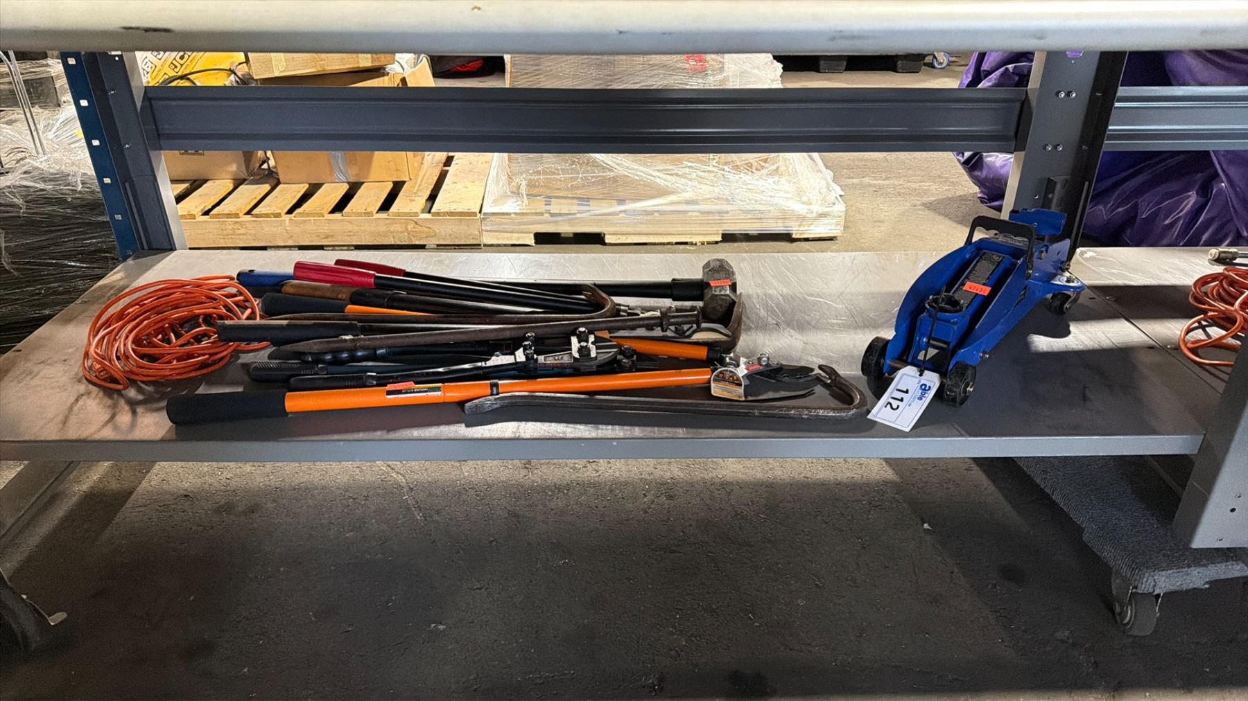 SHELF OF ASSORTED LARGE TOOLS, EXTENSION CORD, PRY BARS, BOLT CUTTERS, & MOBILE HYDRAULIC FLOOR JACK *MUST TAKE ALL*