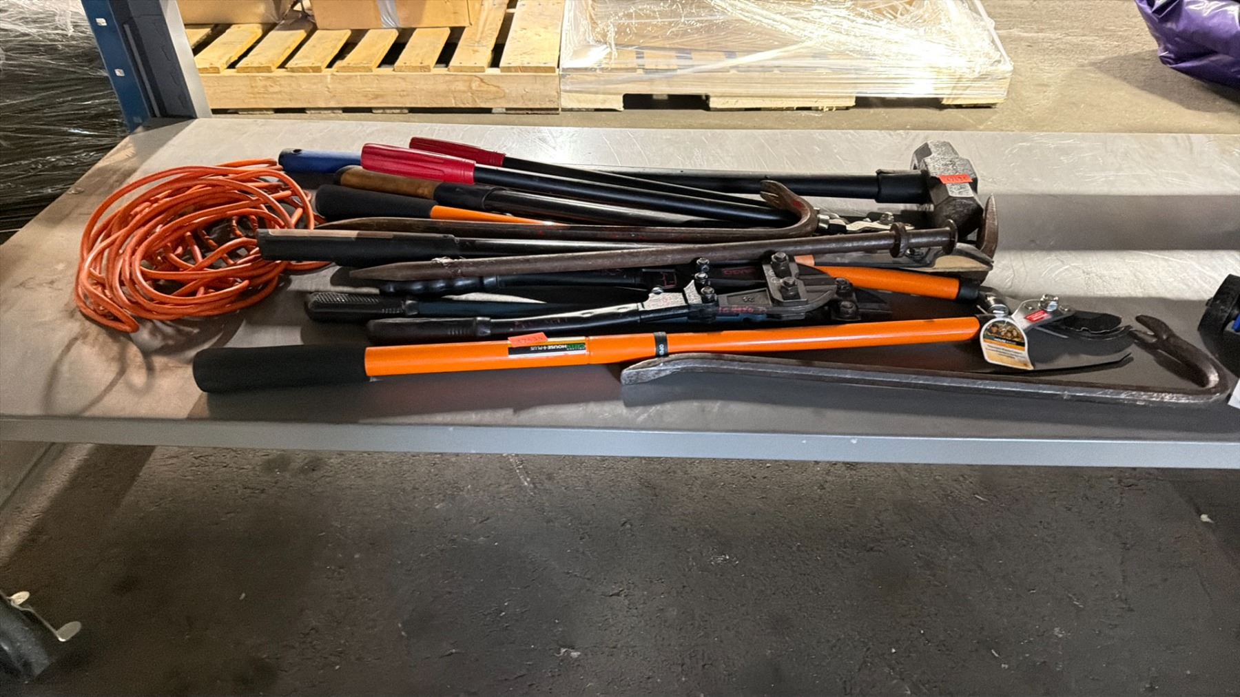 SHELF OF ASSORTED LARGE TOOLS, EXTENSION CORD, PRY BARS, BOLT CUTTERS, & MOBILE HYDRAULIC FLOOR
