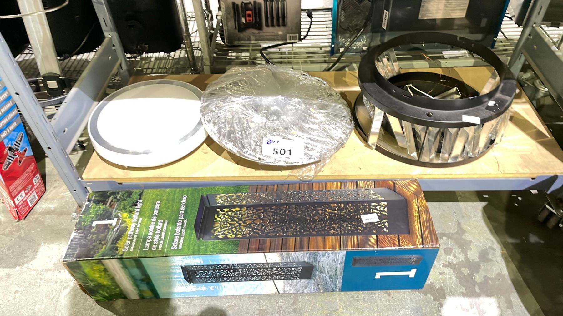 SHELF OF ASSORTED LIGHTING INCLUDING; CEILING LIGHTS, SOLAR PATHWAY BOLLARD LIGHTS & MORE