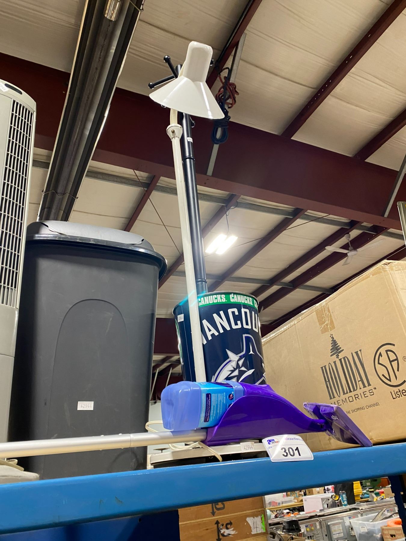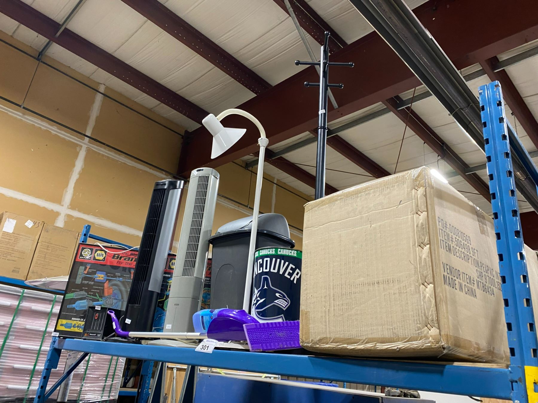 SHELF OF ASSORTED OFFICE SUPPLIES INCLUDING 2 TOWER FANS, STANDING LAMP, ILLUMINATED NAPA SIGN, CHRISTMAS TREE, AND GARBAGE CANS