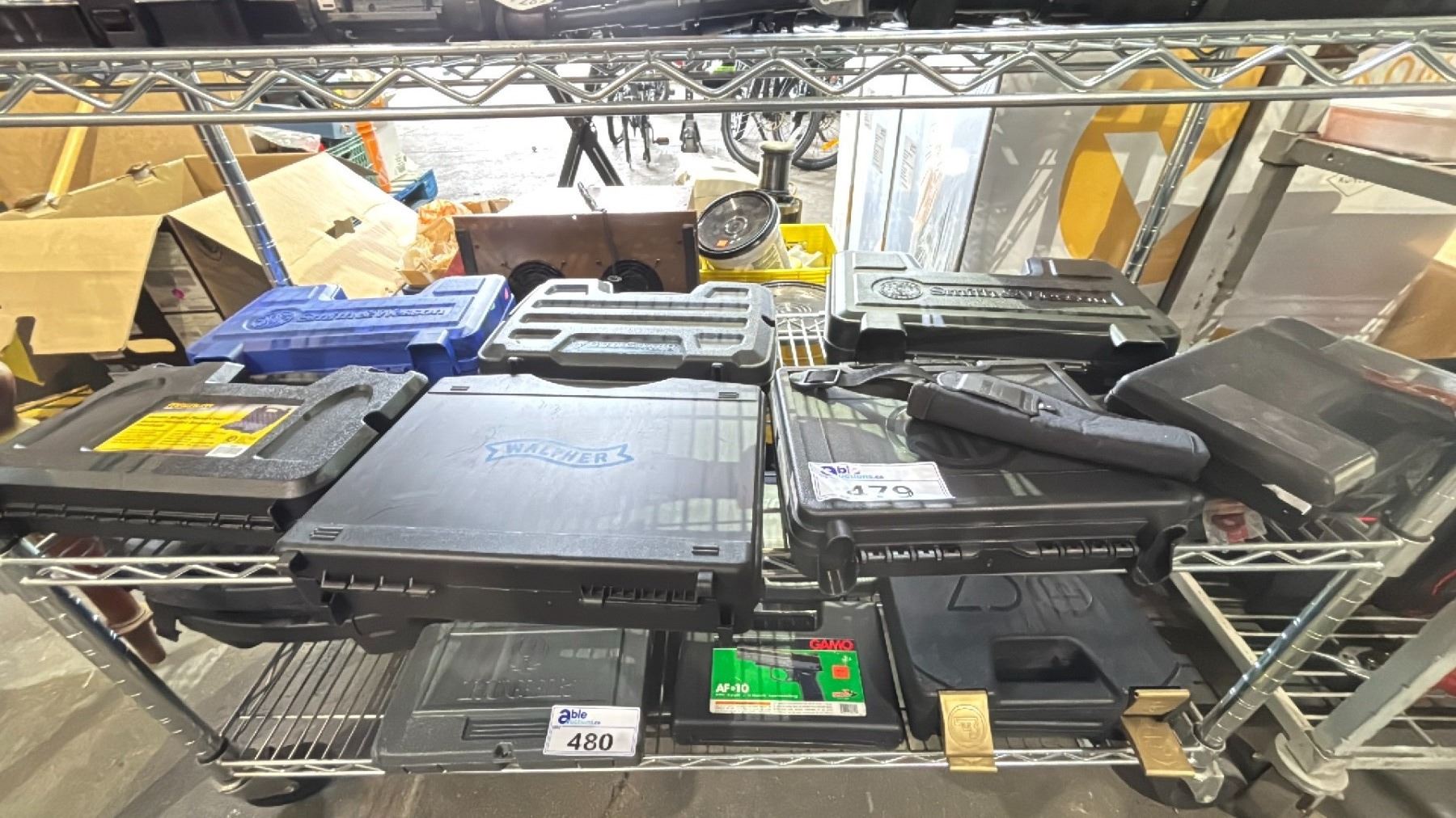 SHELF OF ASSORTED PLASTIC GUN CASES